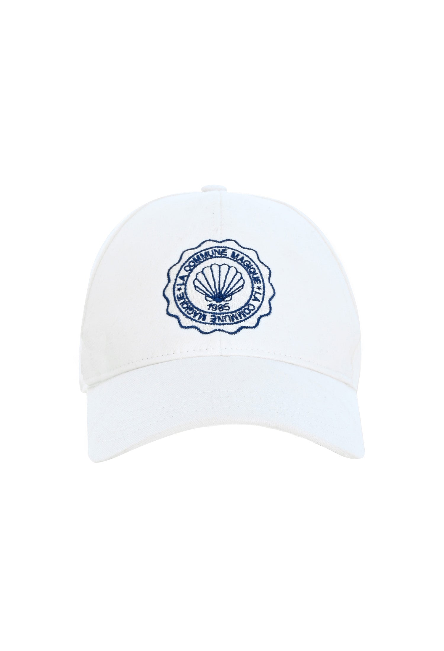 Ivory baseball cap with signature embroidered seashell logo, crafted of 100% cotton.