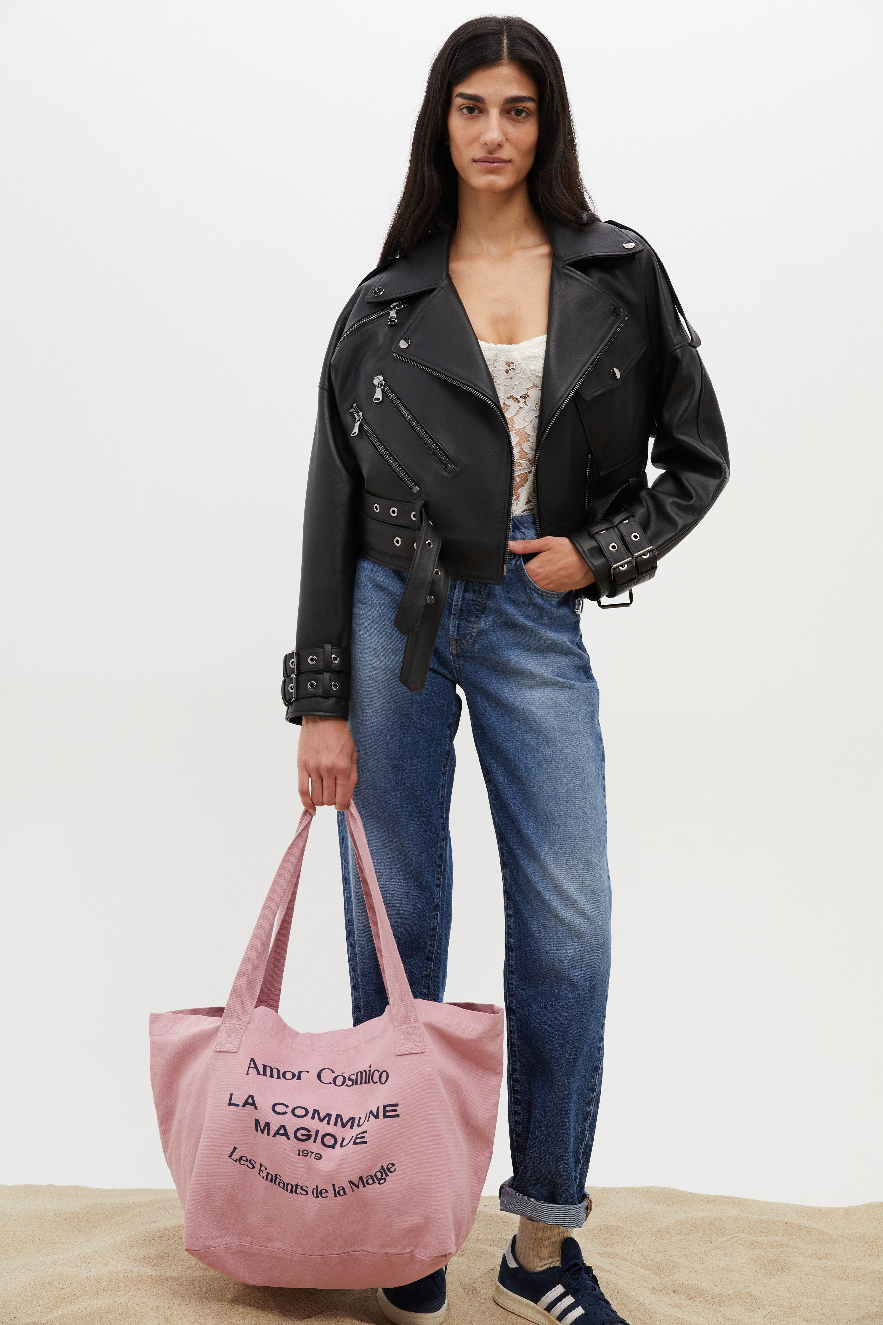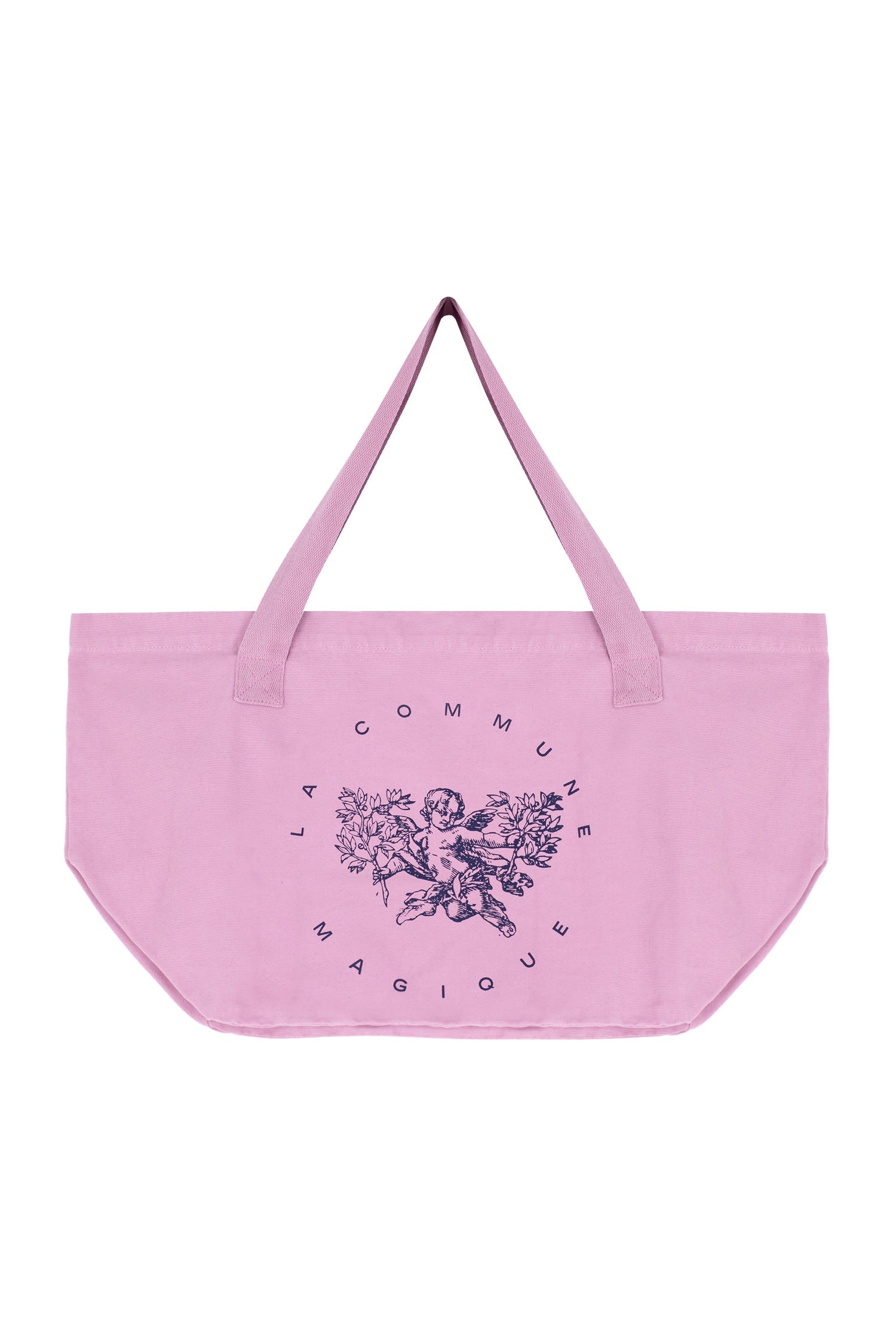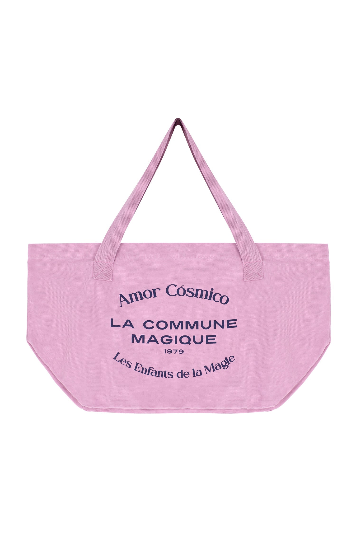 Pink tote bag with navy ''Amor Cósmico'' exclusive design, crafted of 100% cotton.