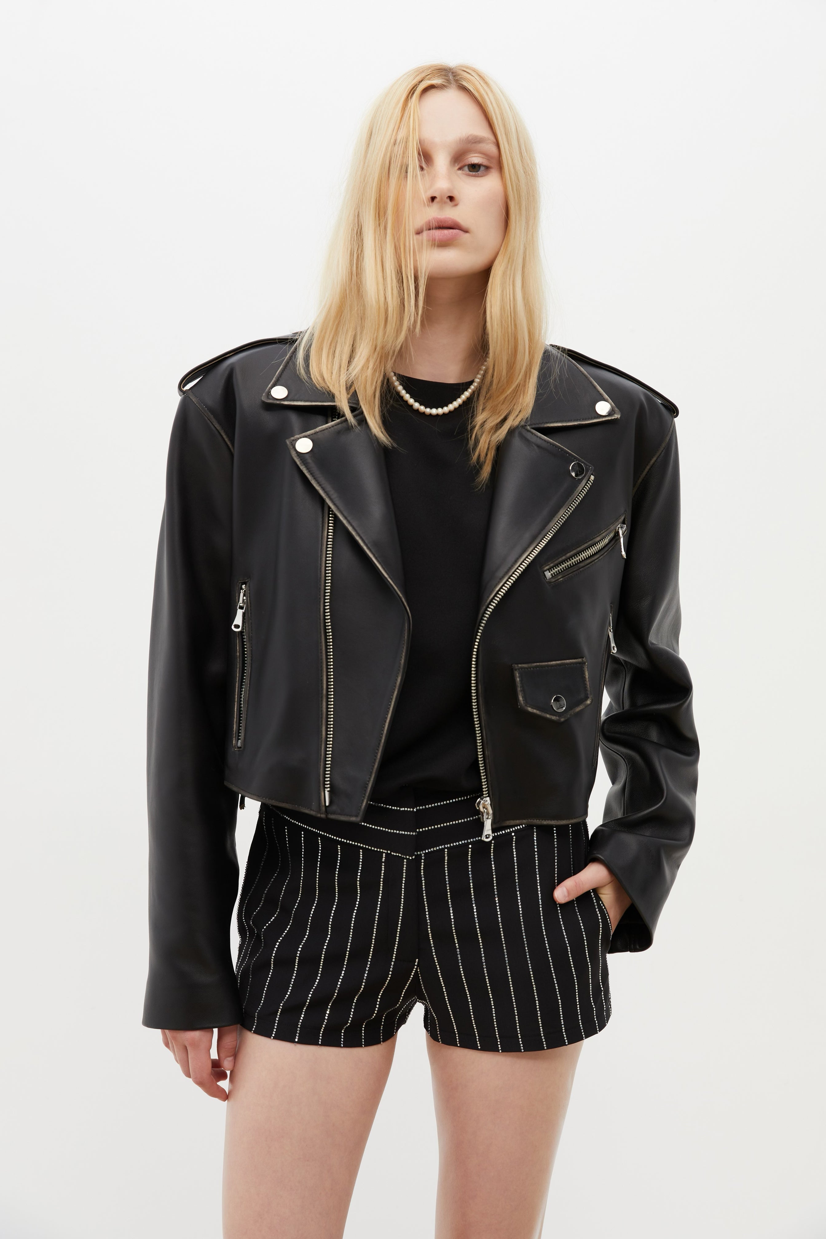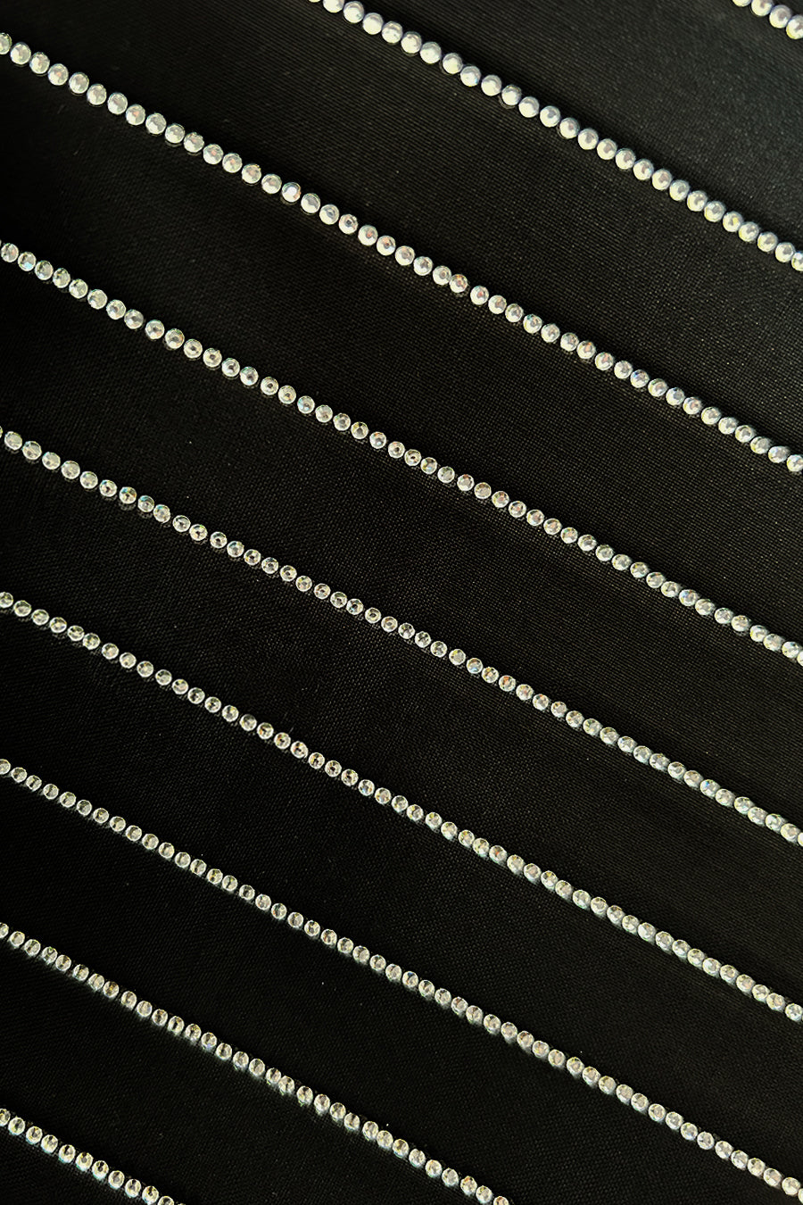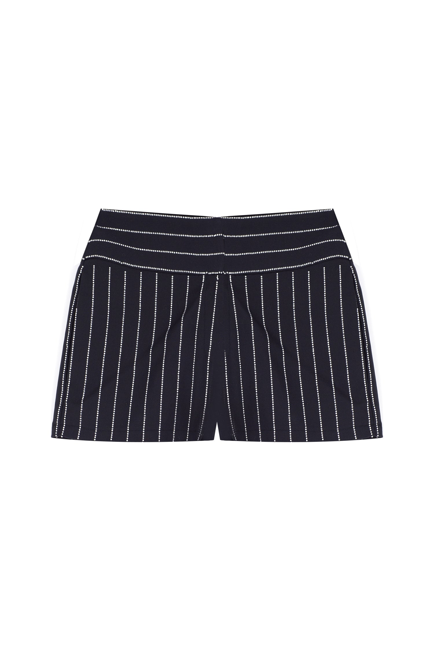 La Commune Magique original black low-rise shorts with jewelled pinstripe detailing.