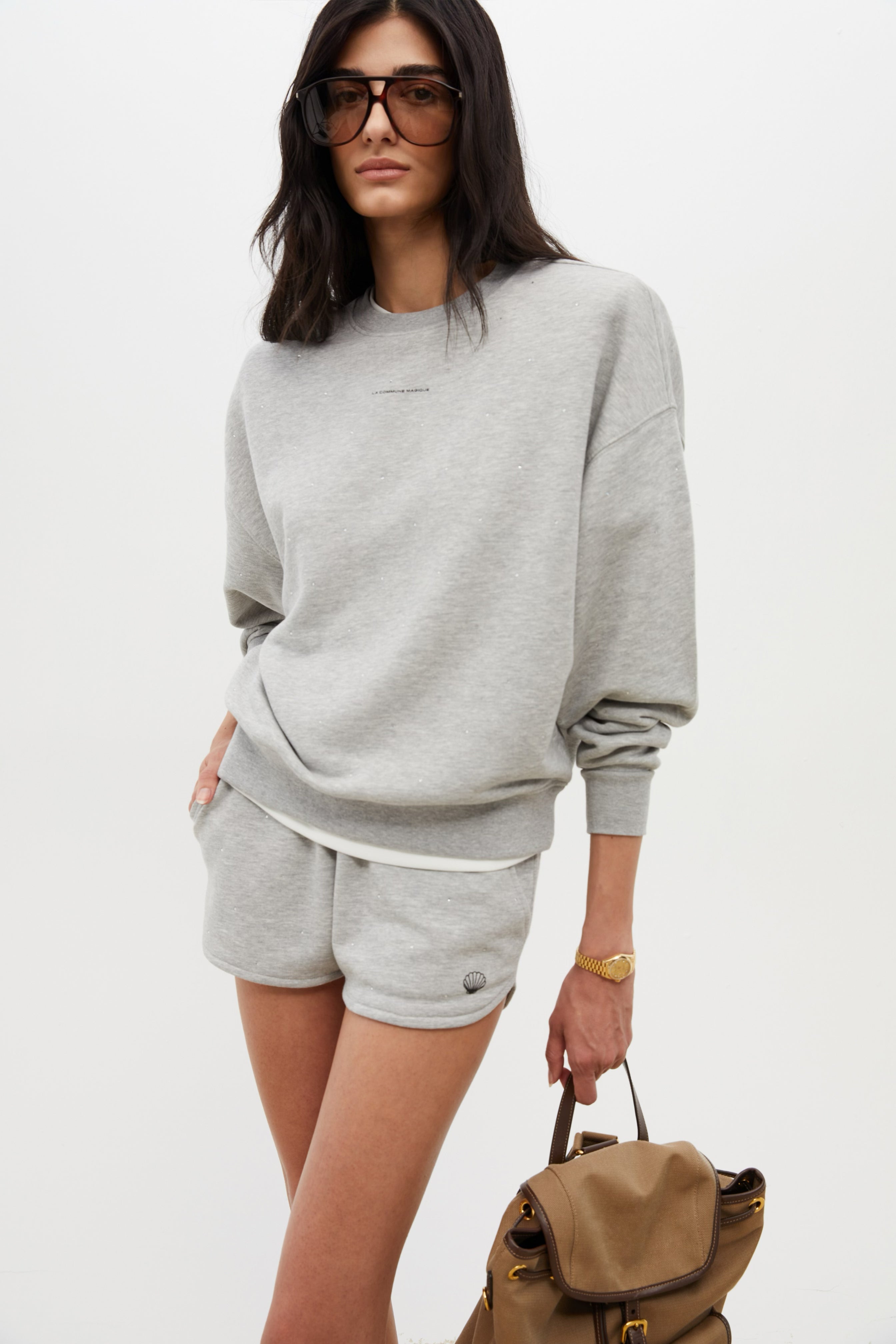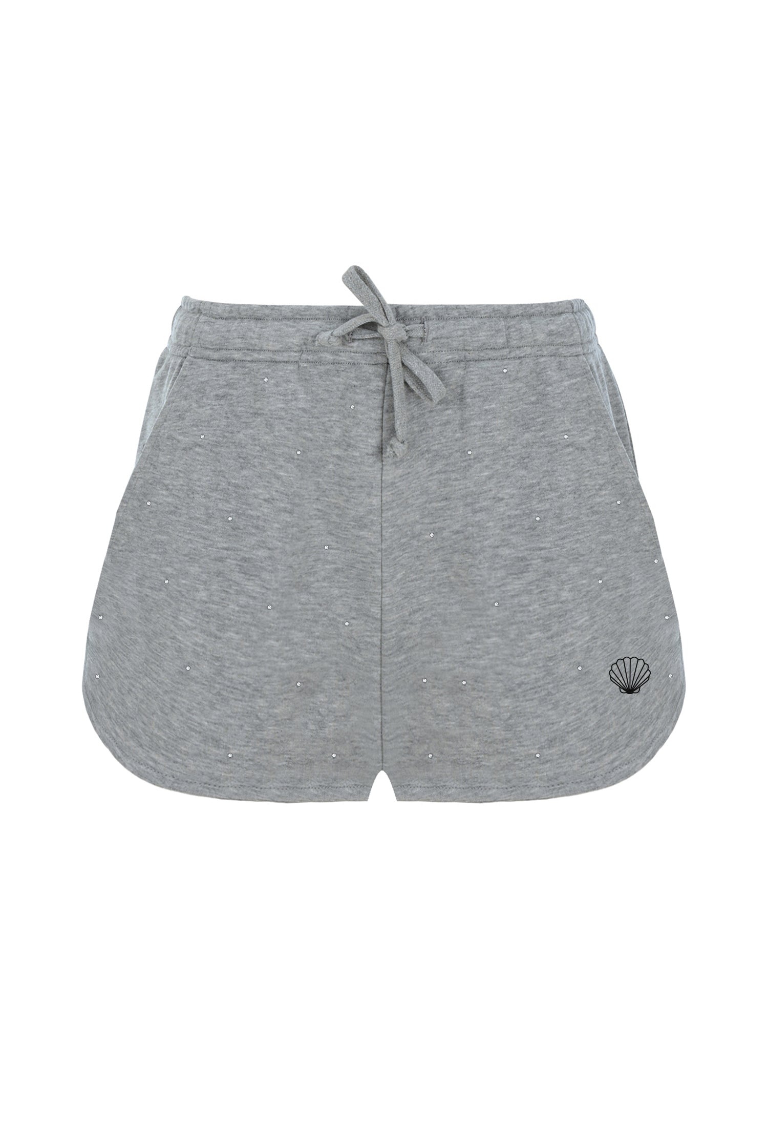 Light grey jewelled sweatshorts with embroidered seashell detail, crafted from cotton blend.