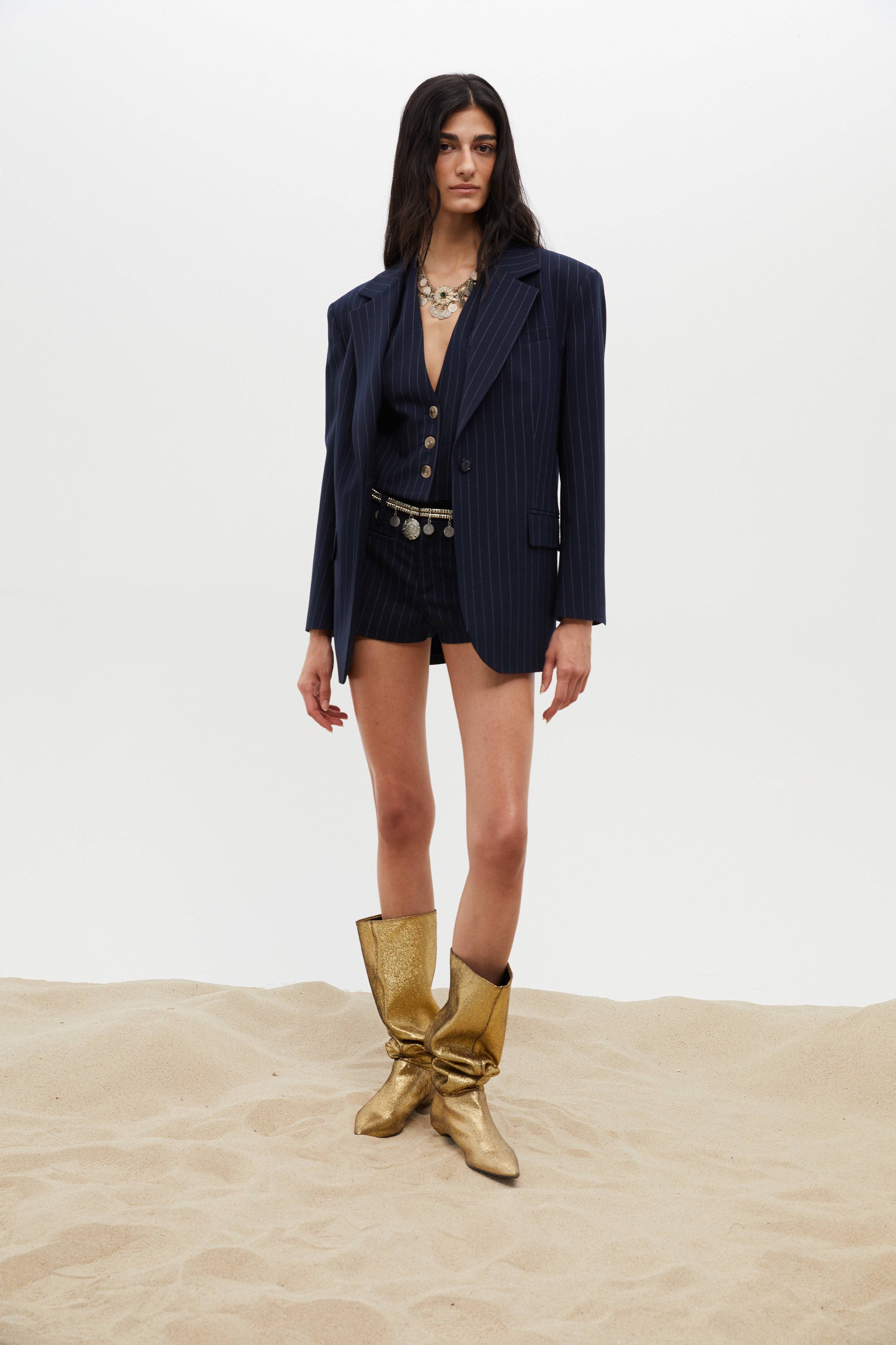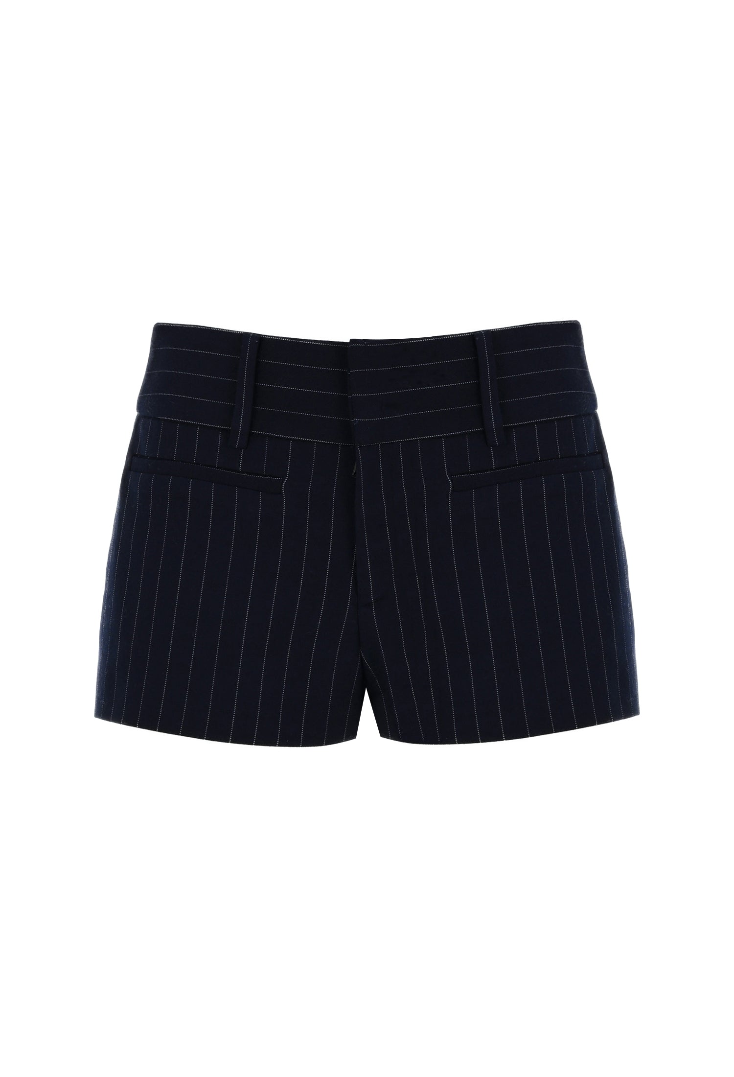 Dark navy low-rise shorts with thin pinstripe detailing, crafted from virgin wool.