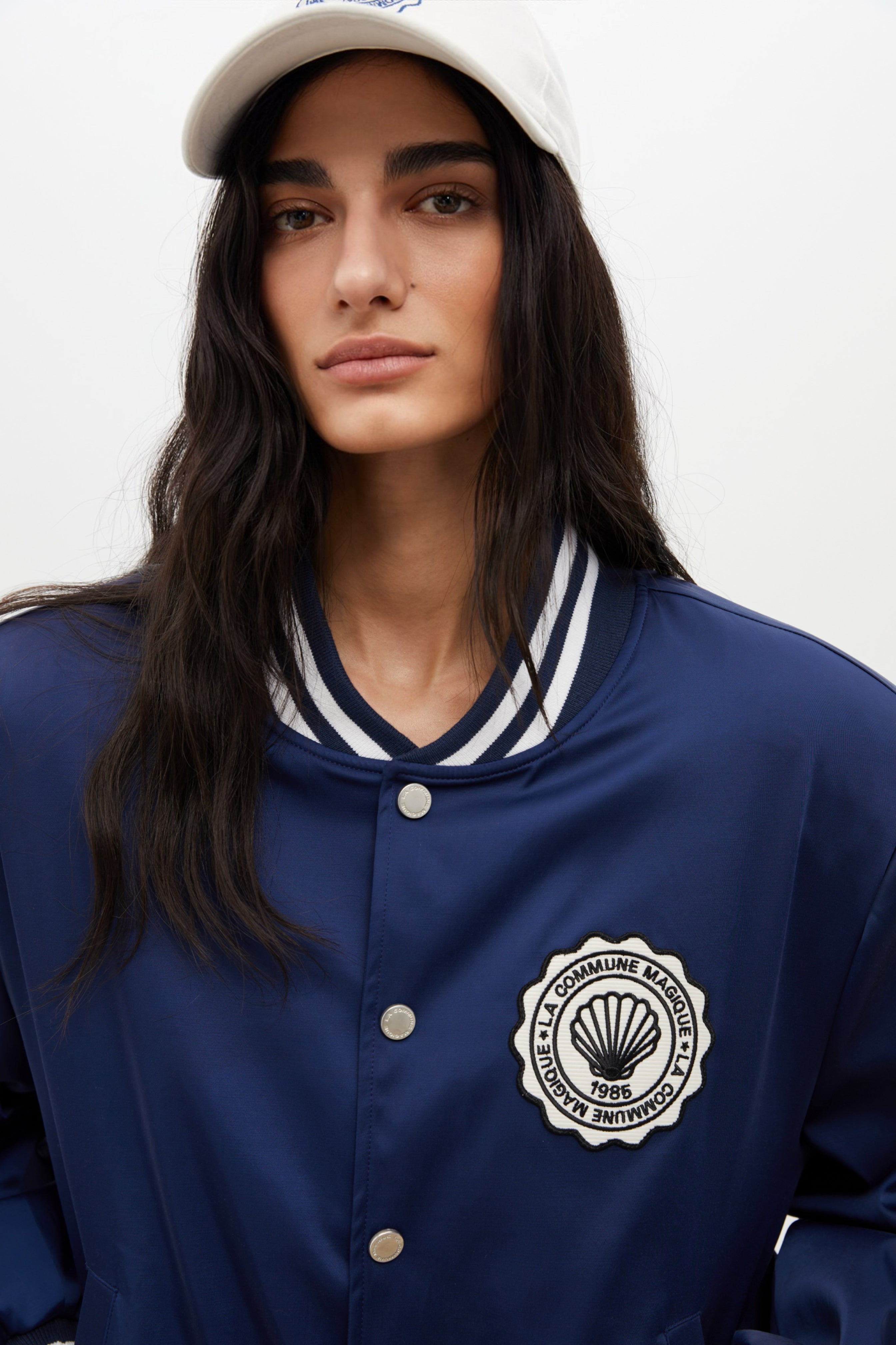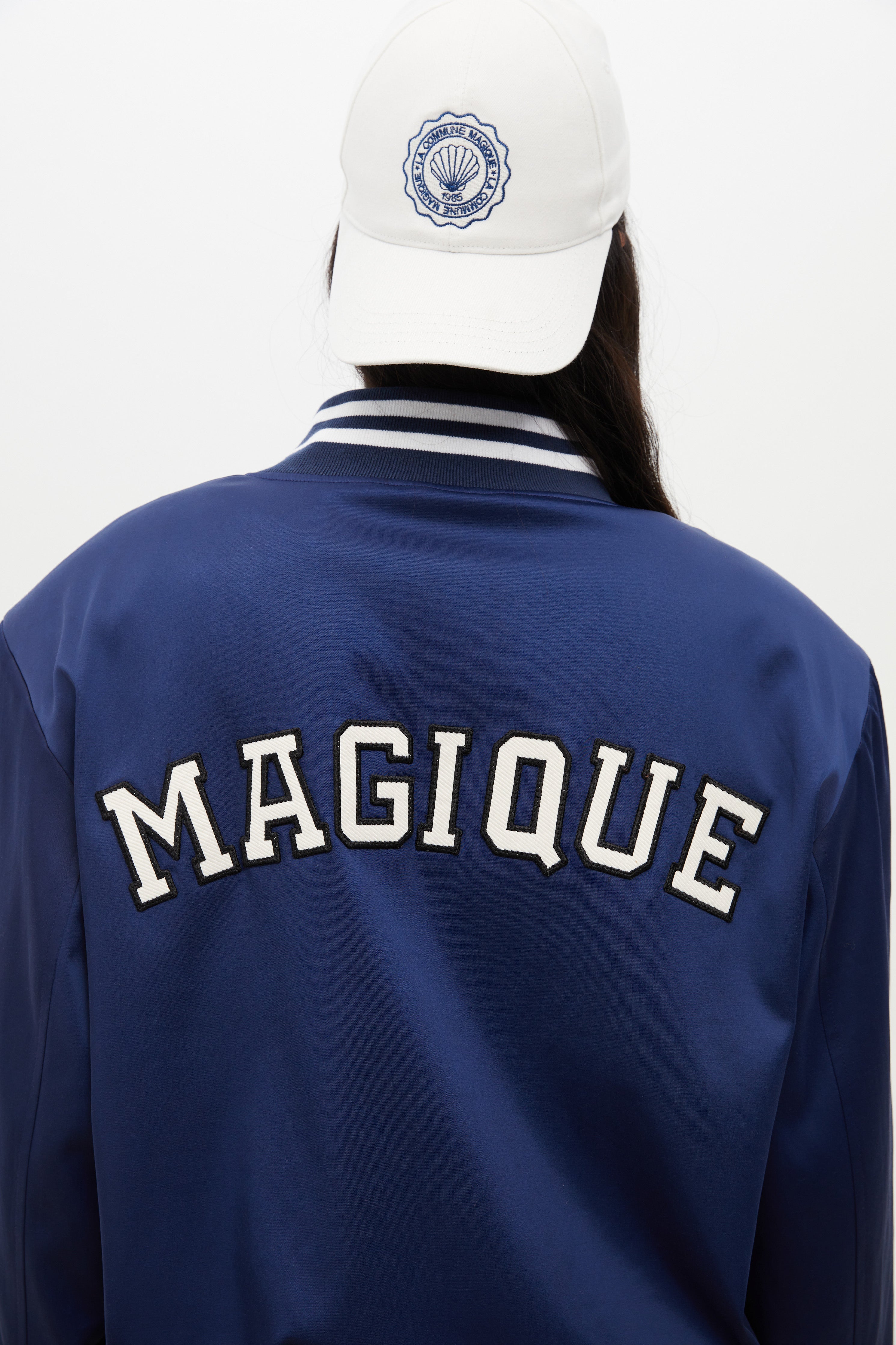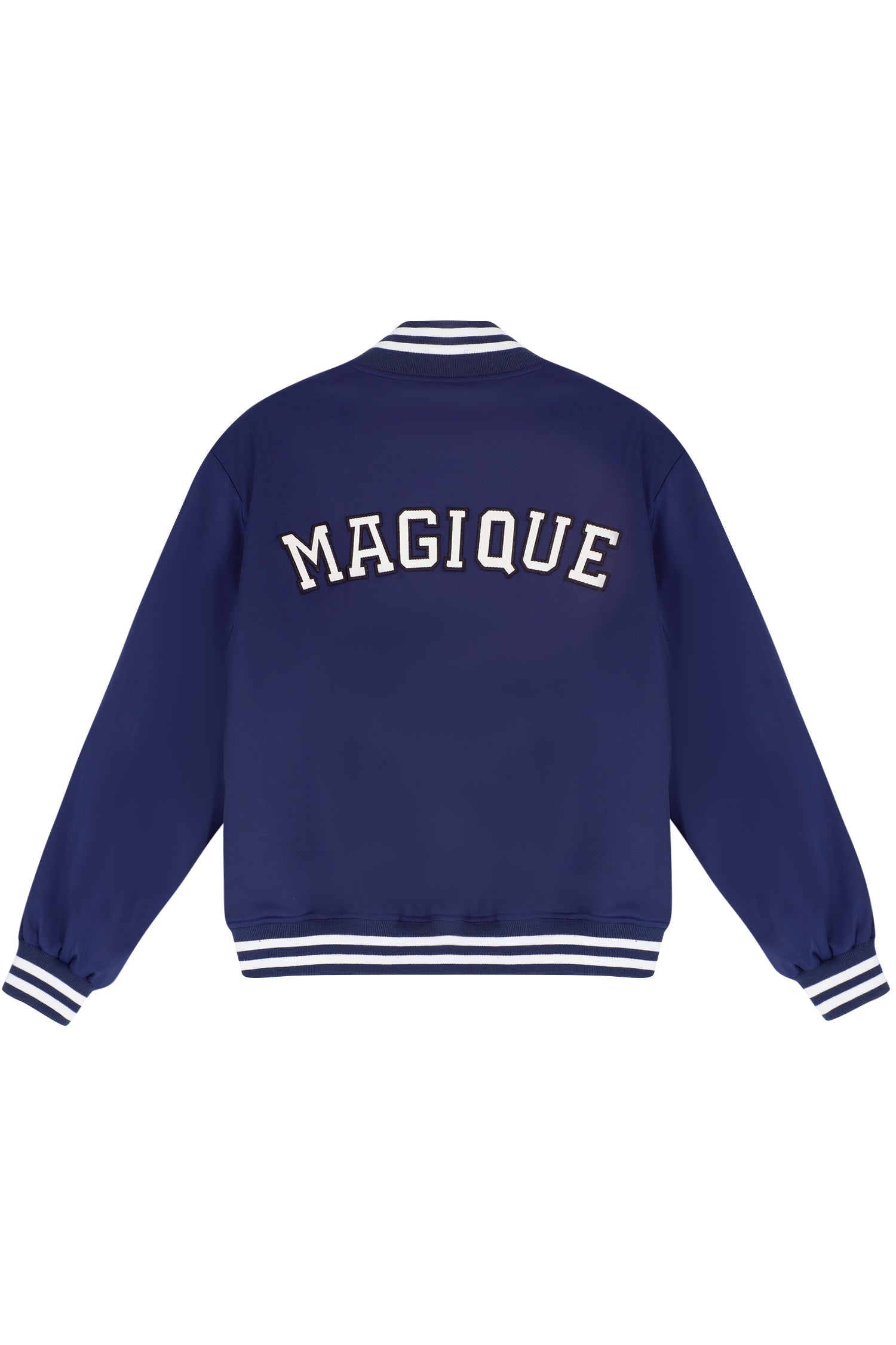 Button up navy college jacket with signature La Commune Magique patch, white details and hand embroidered ''MAGIQUE'' design at the back.
