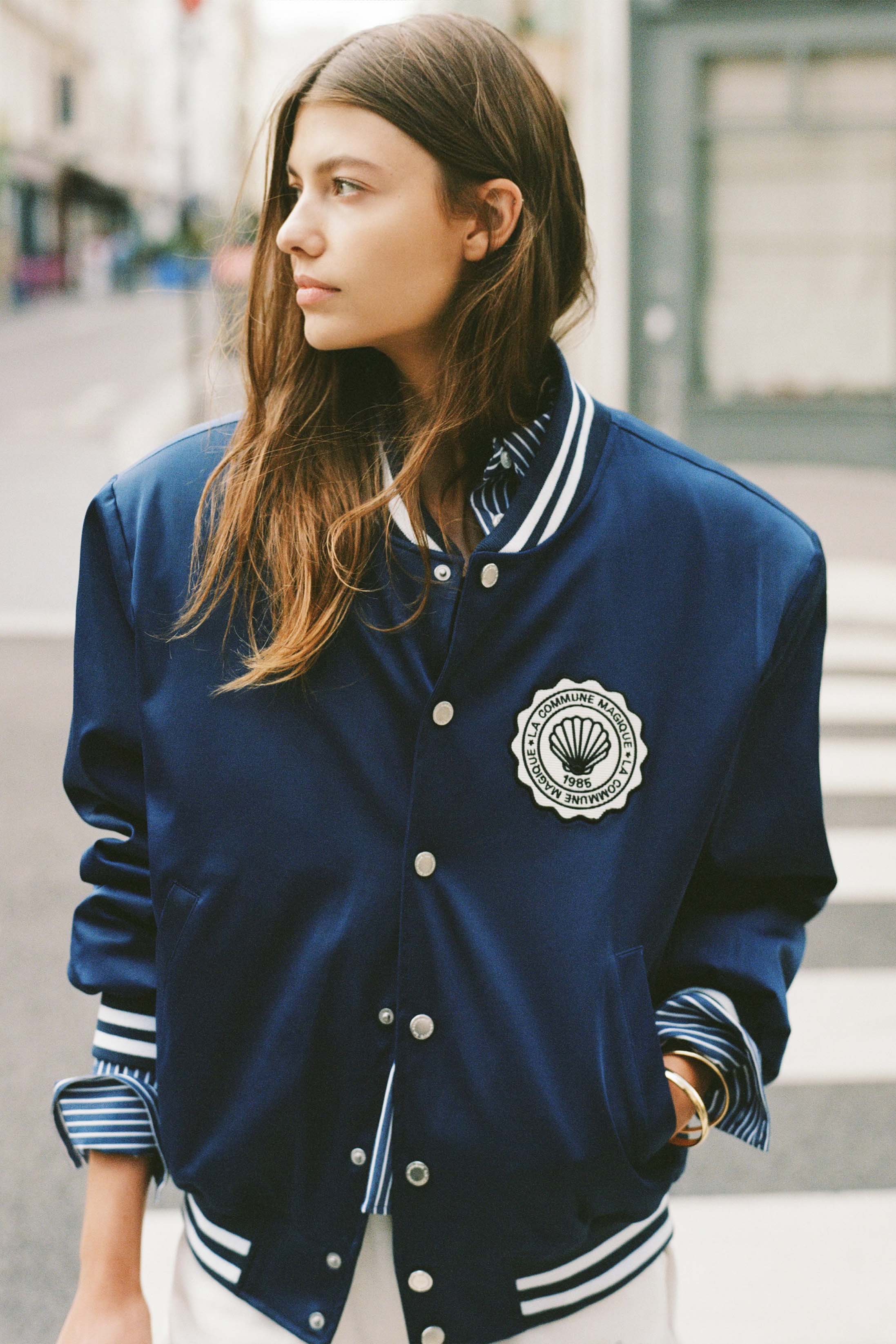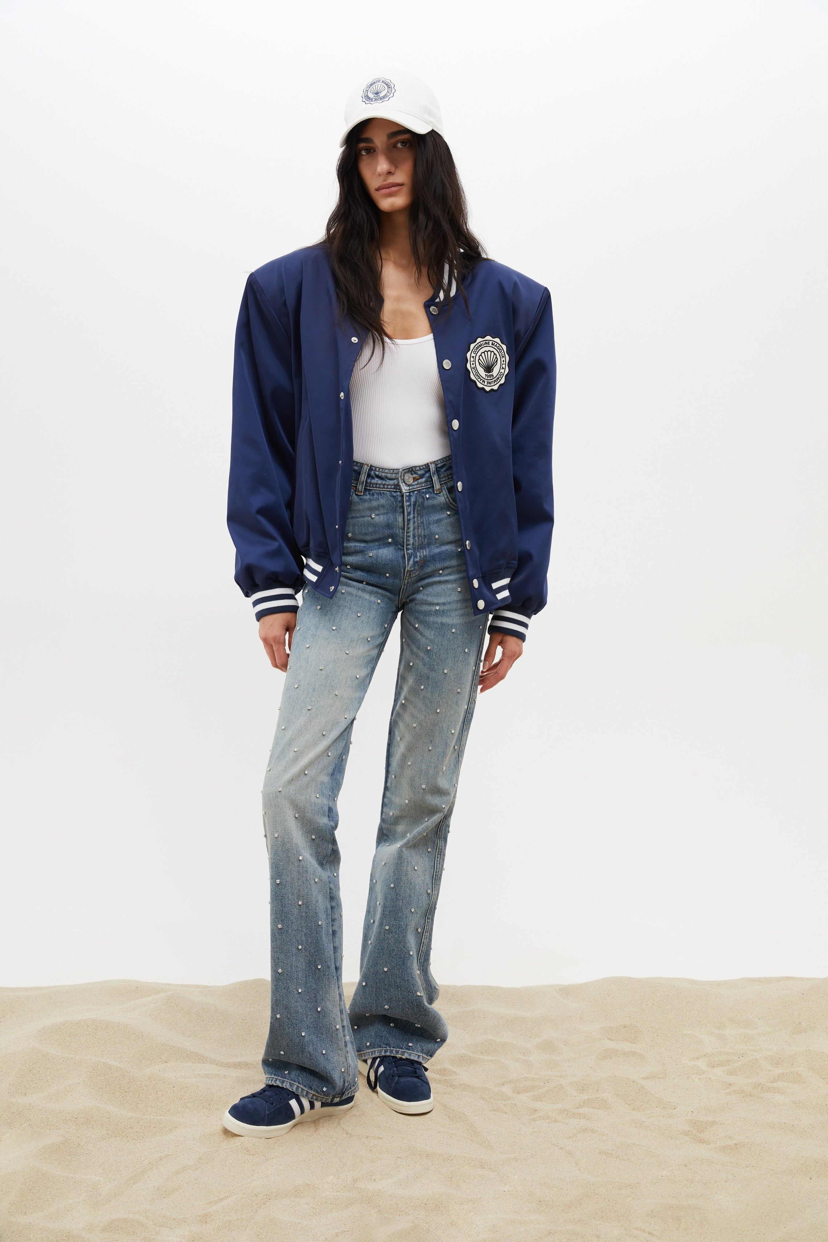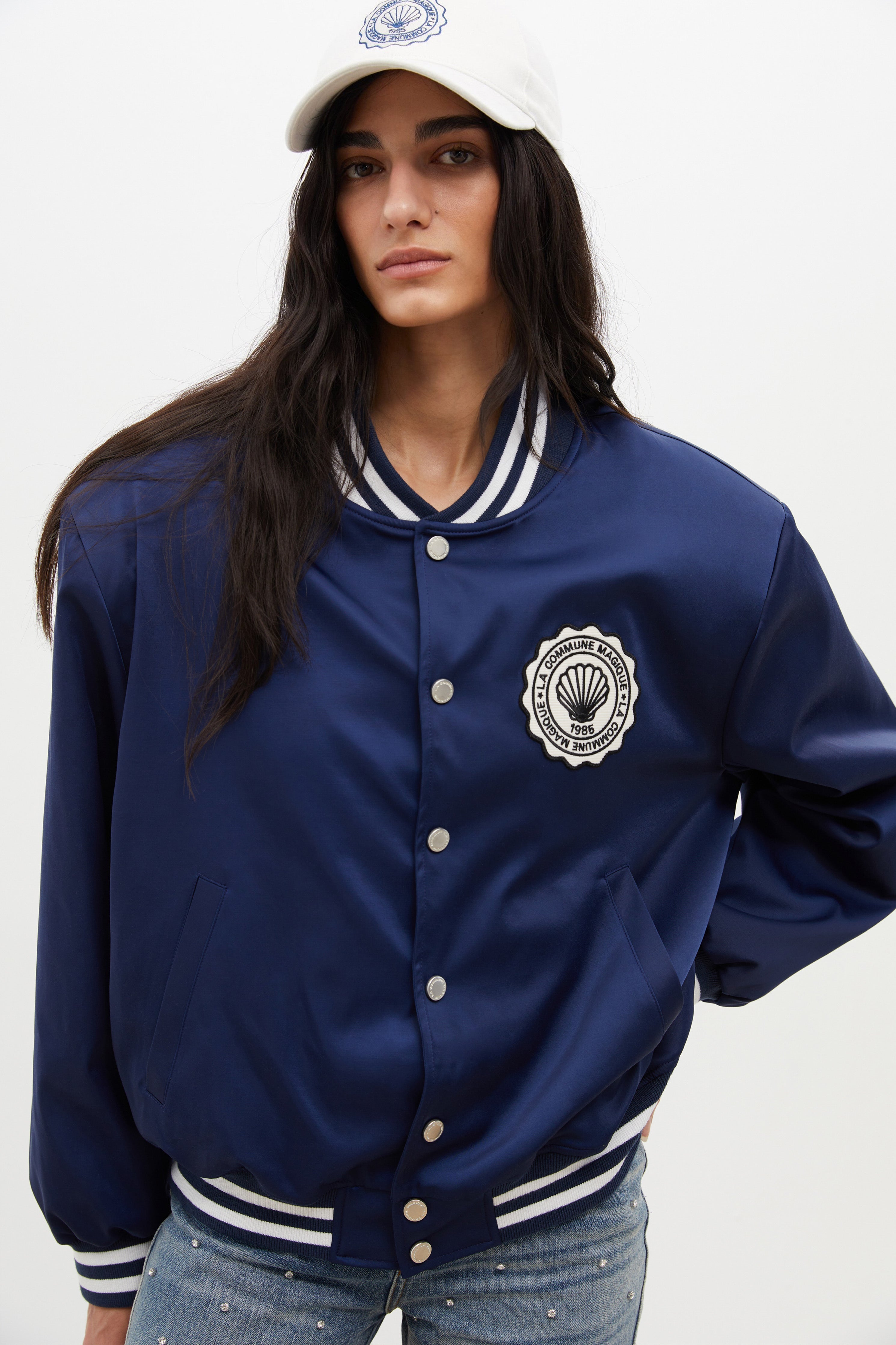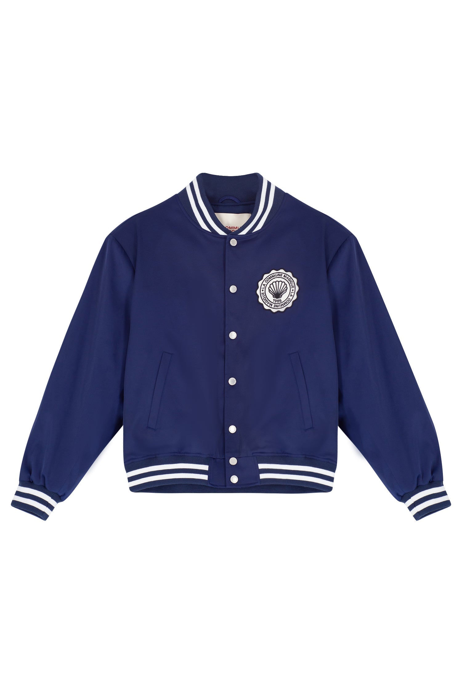 Button up navy college jacket with signature La Commune Magique patch, white details and hand embroidered ''MAGIQUE'' design at the back.
