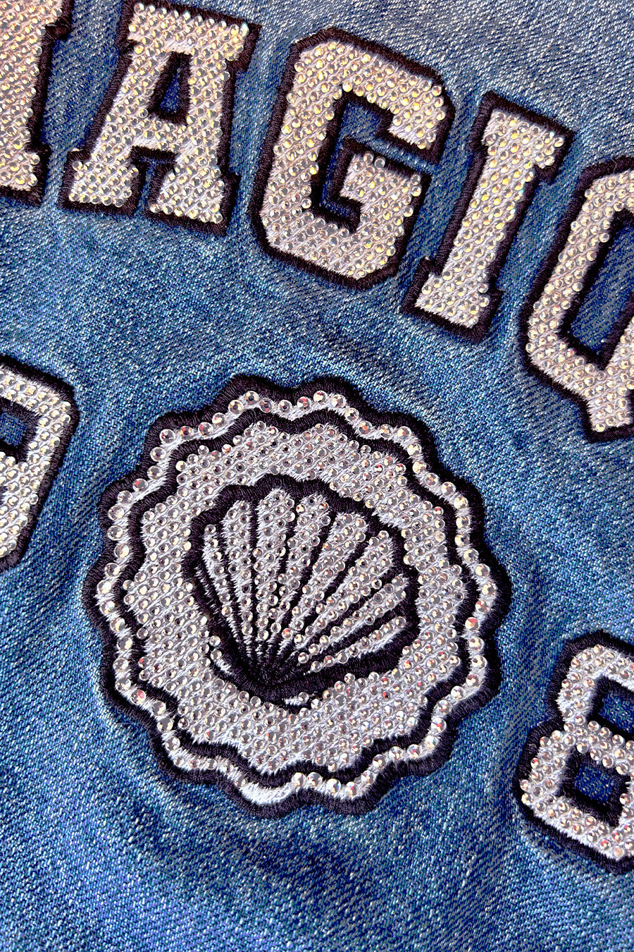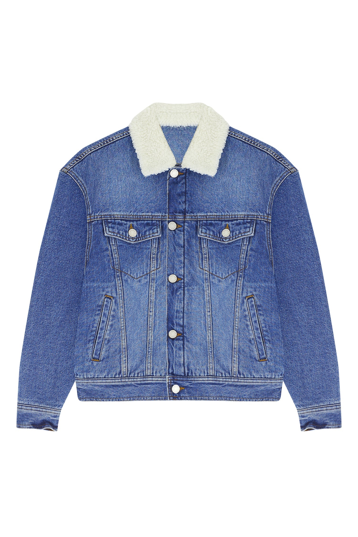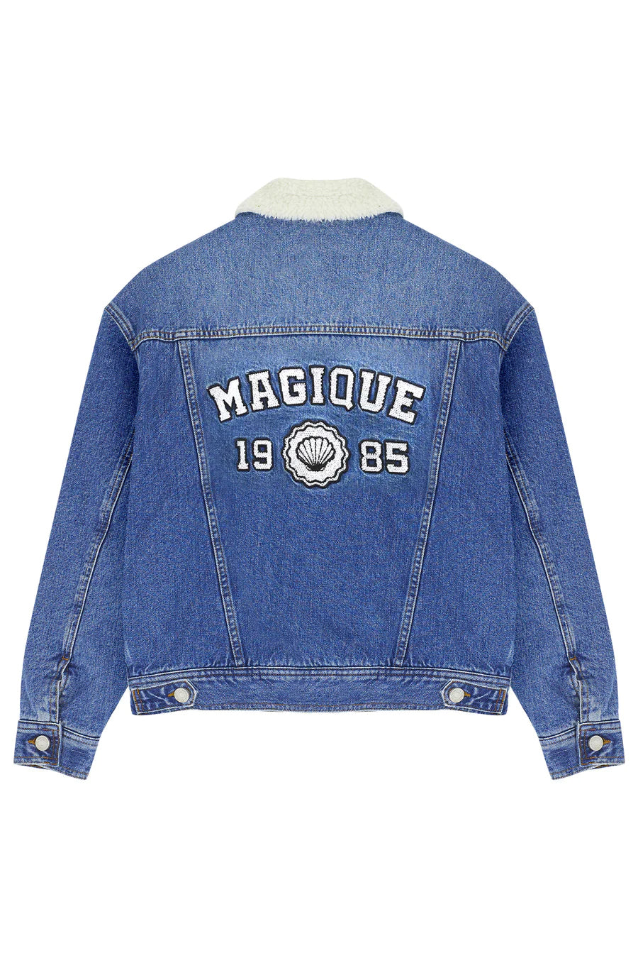 Jewelled blue denim jacket with faux shearling lining, crafted of 100% cotton.