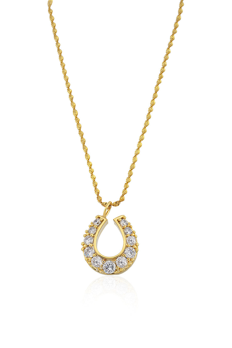 The necklace is made of brass with a gold plating, and it features zircon stones.