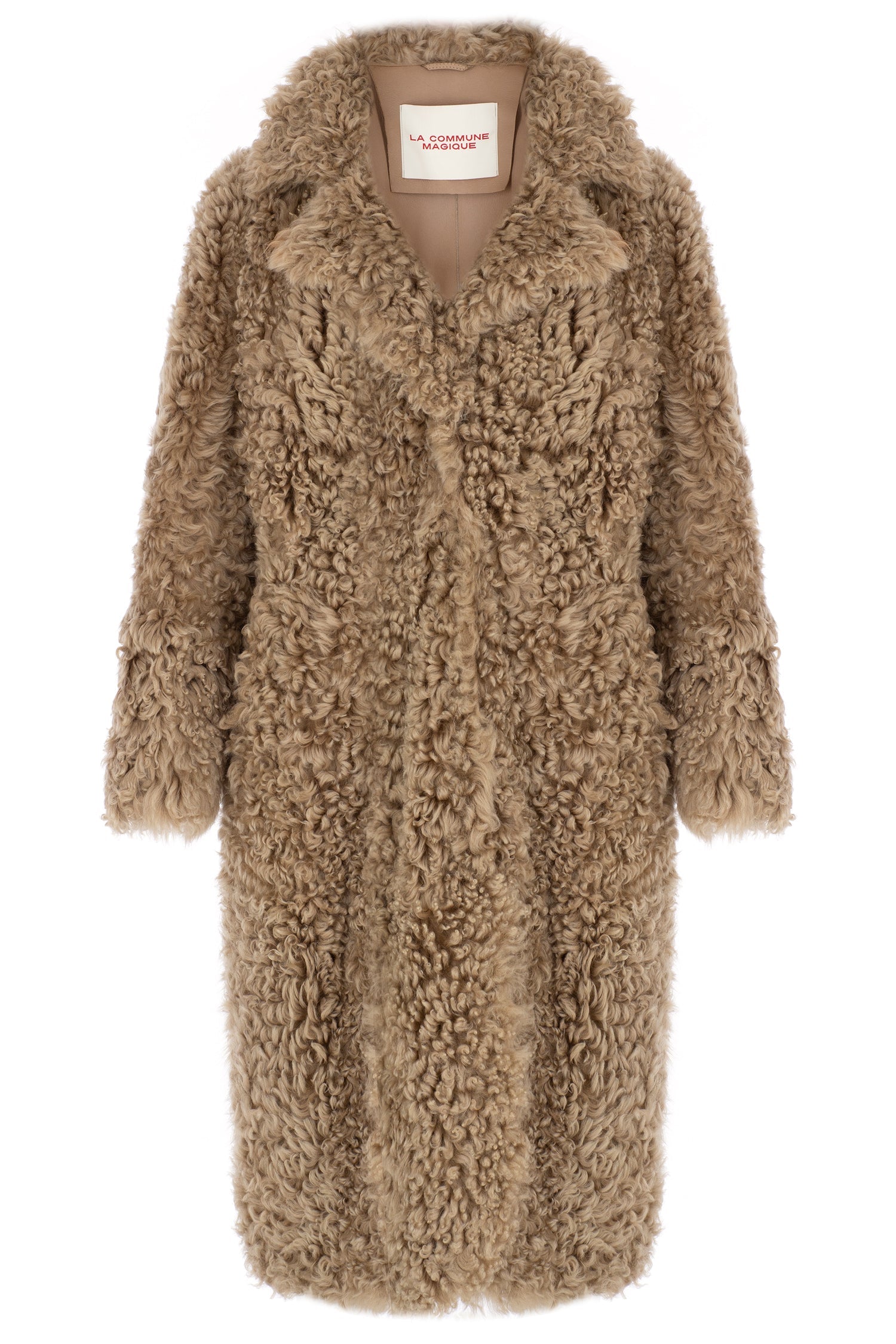 Biscuit brown long shearling coat with notch lapel, crafted of authentic Toscana lambskin.