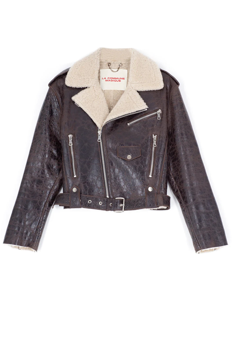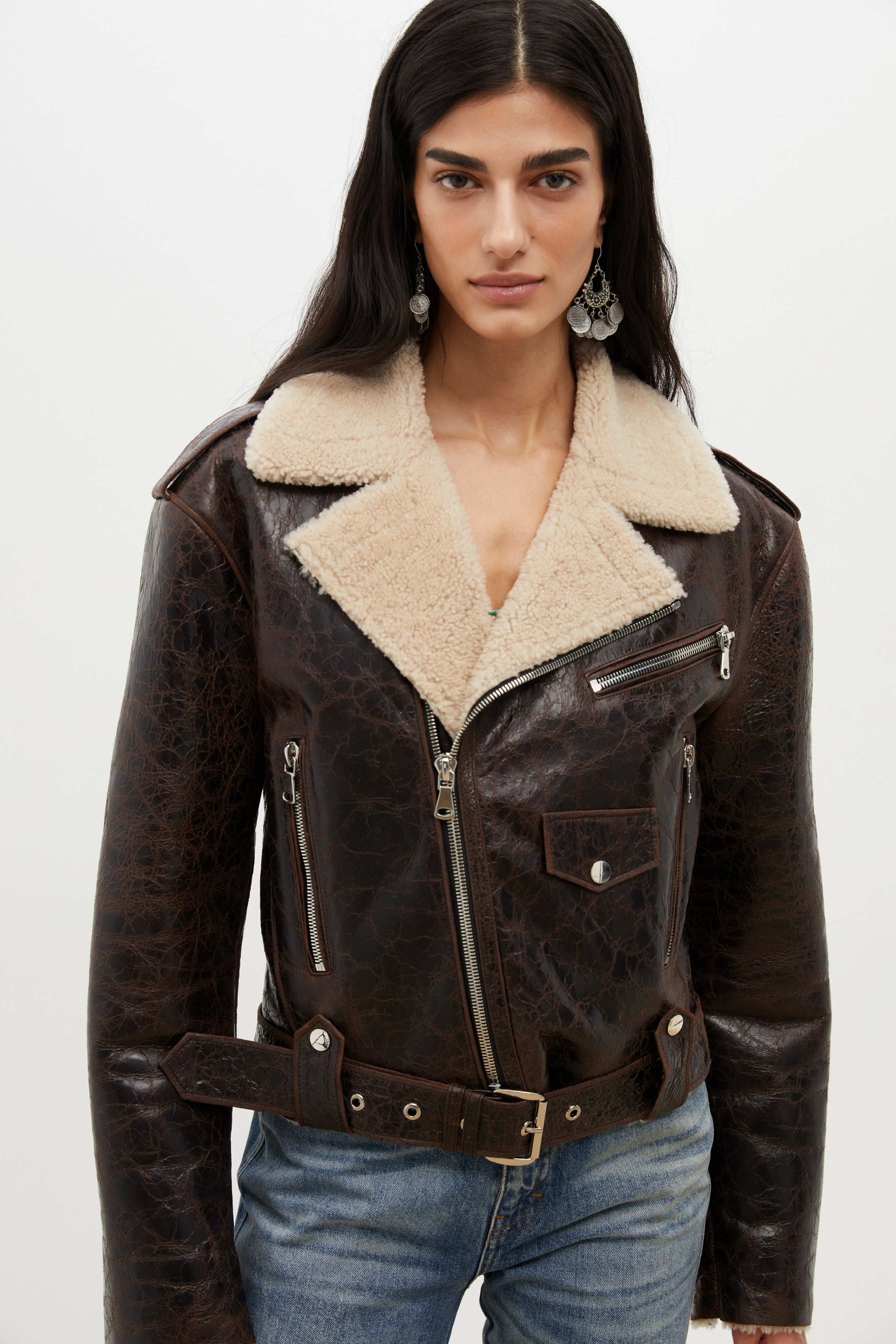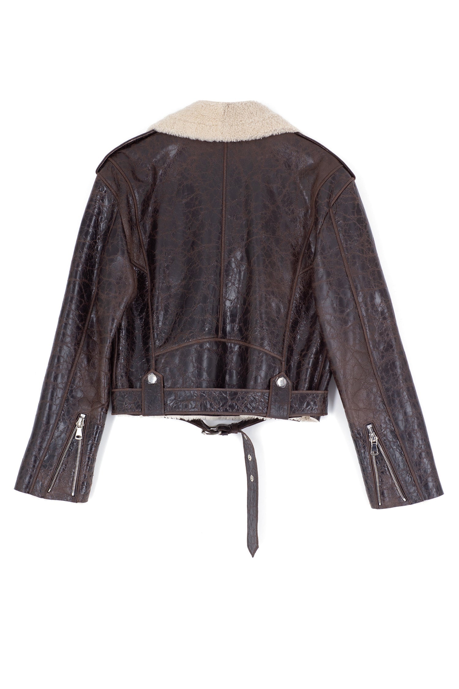 Mahogany cracked leather cross zipped jacket with custom belt, crafted of 100% Spanish Merino leather.