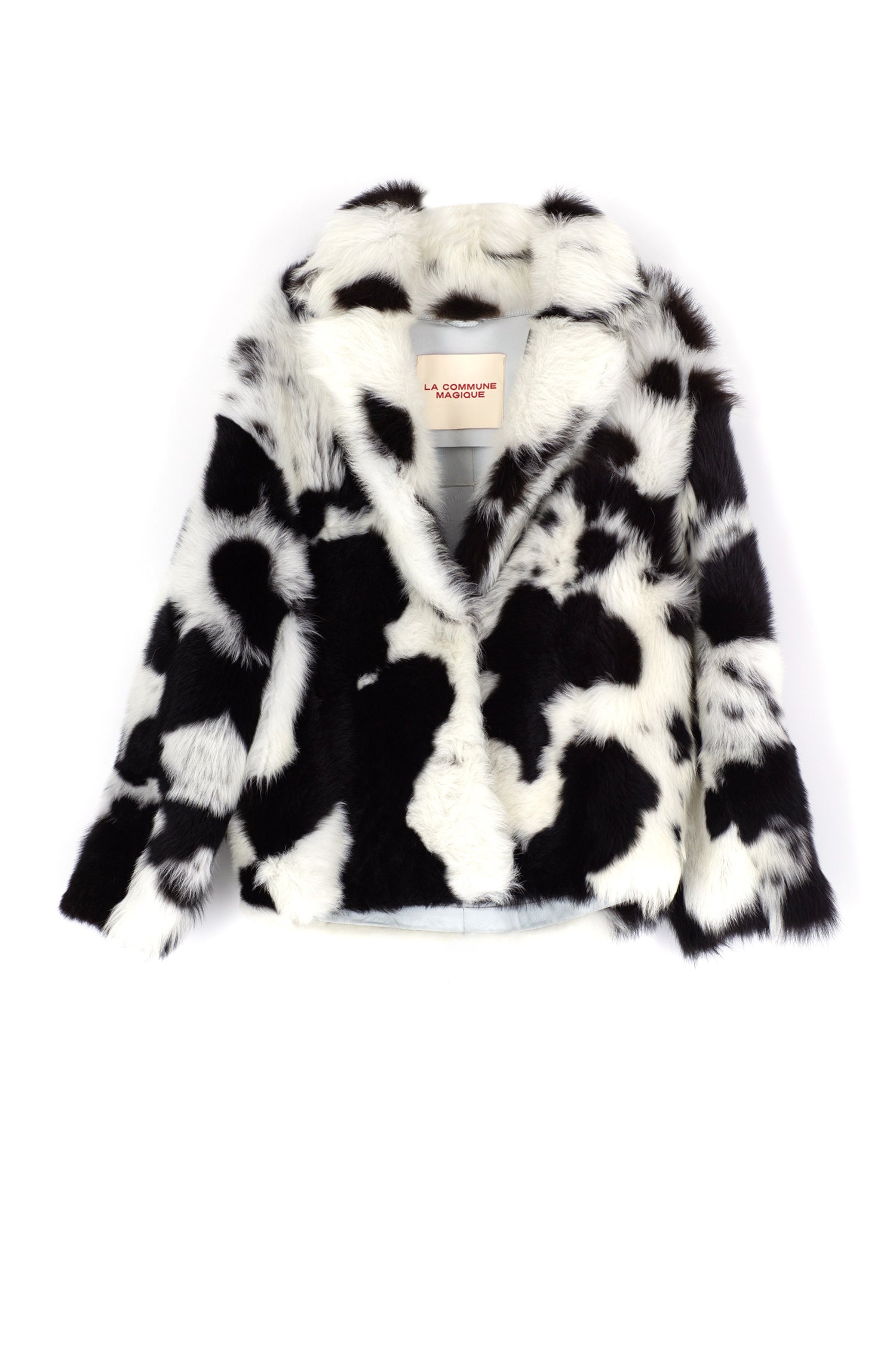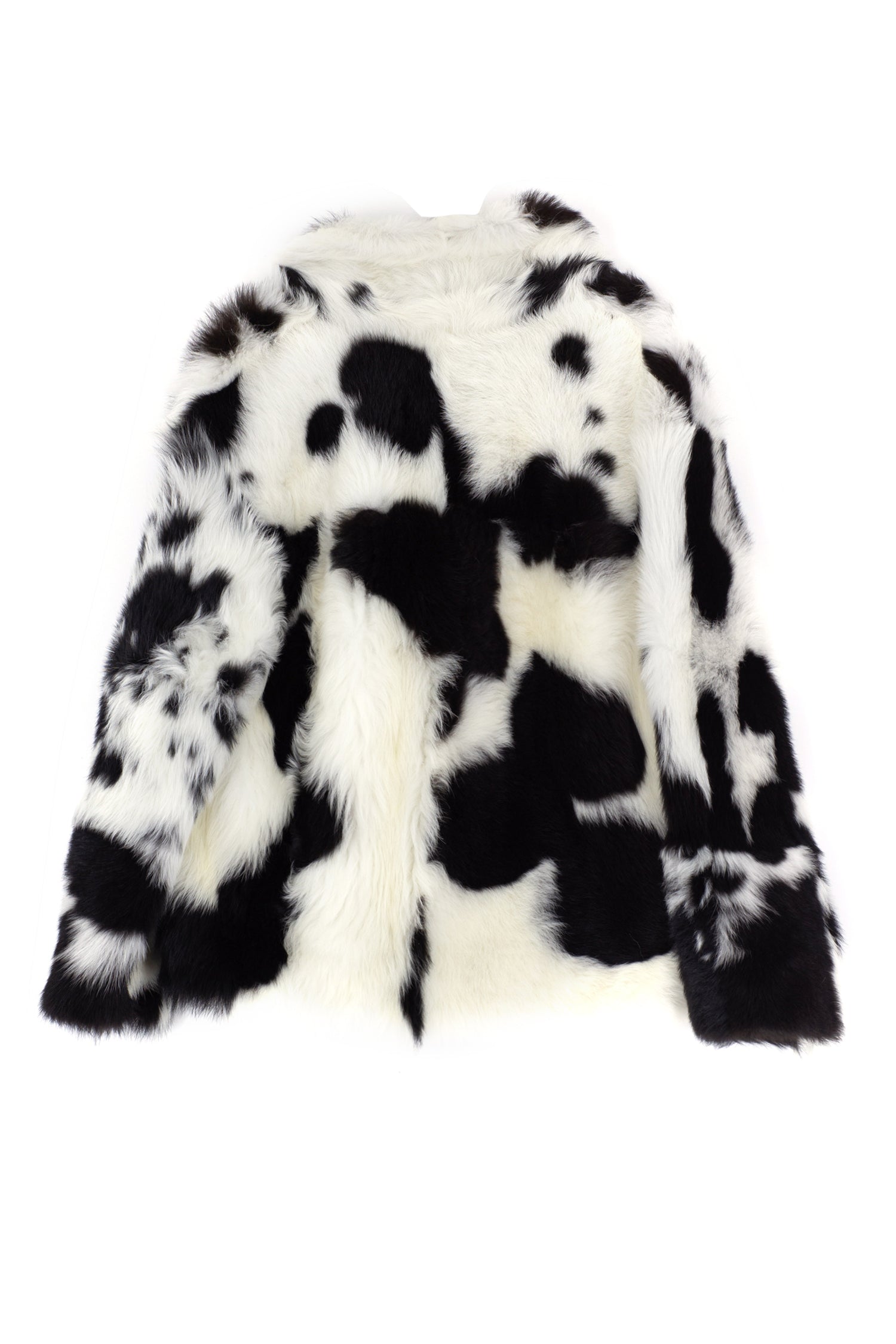 Cowhide pattern single breasted one button shearling jacket, crafted of authentic Toscana lambskin.