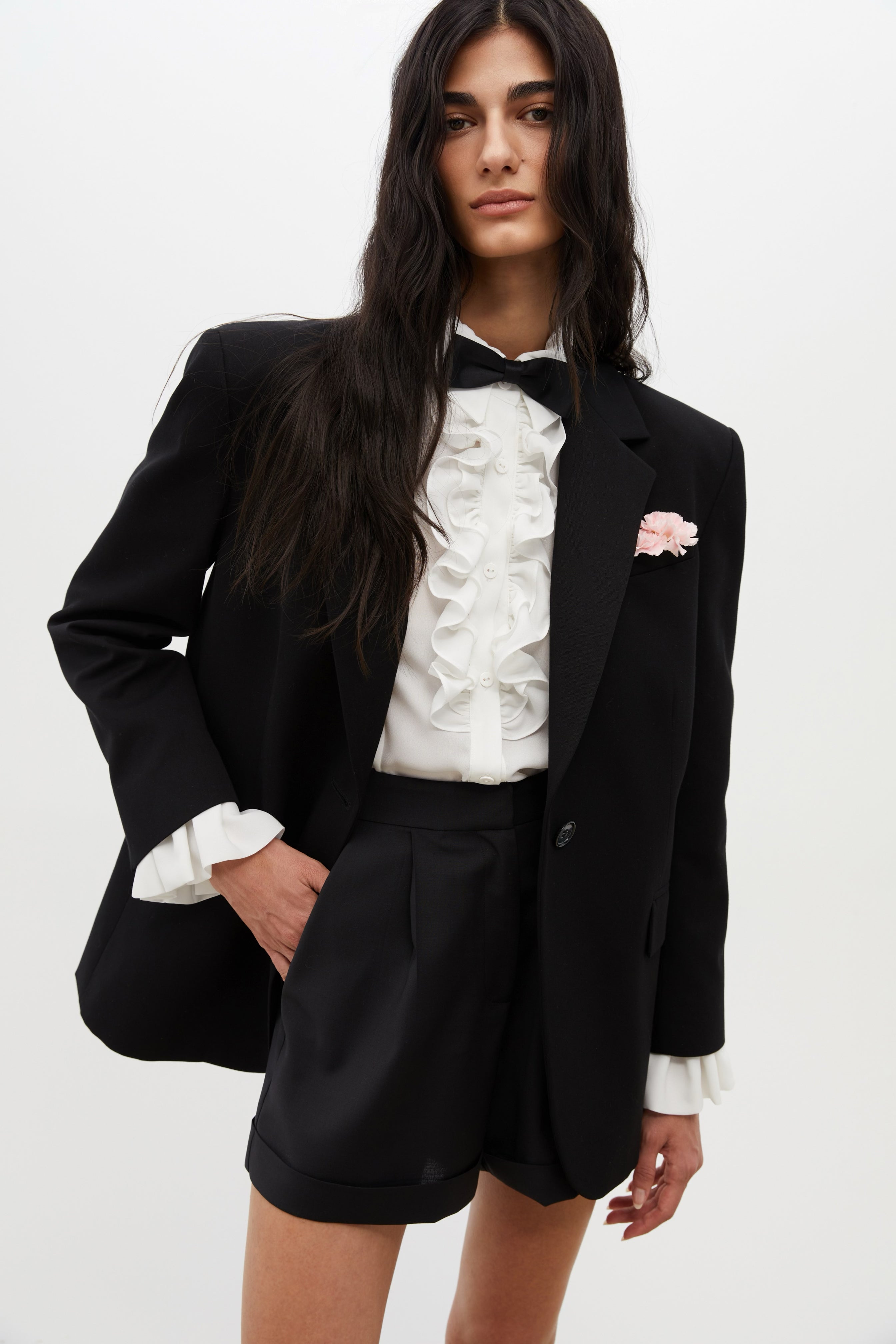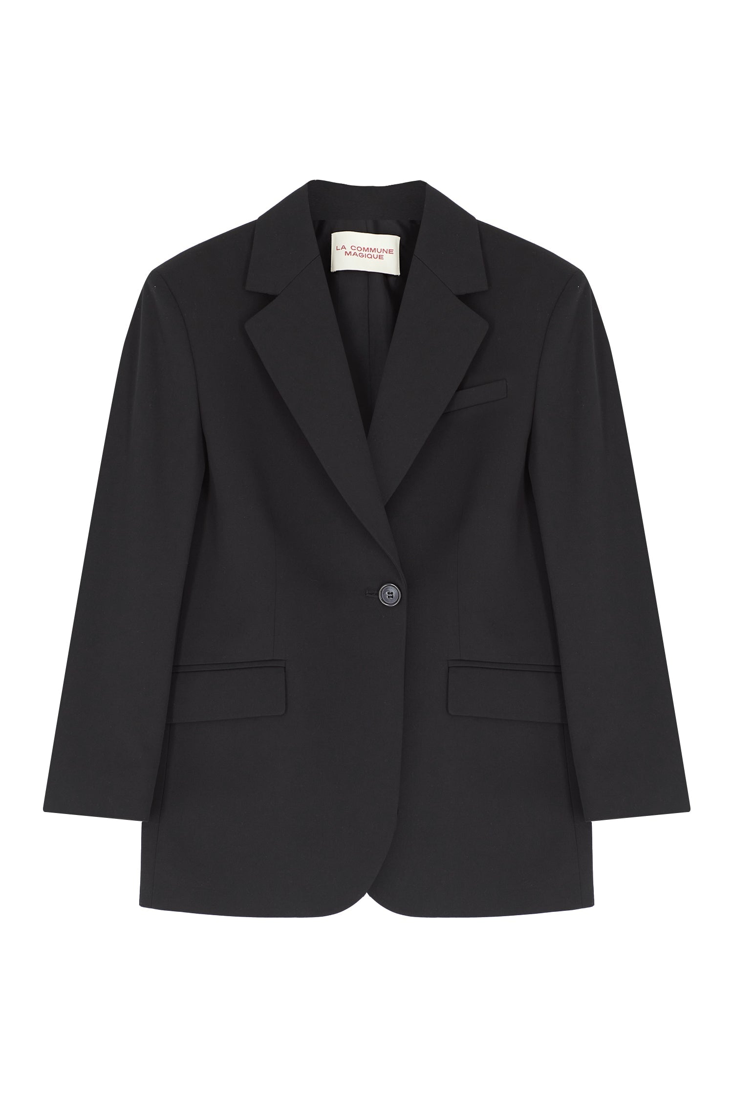 Single breasted black oversized blazer jacket with a wide notch lapel, crafted from cotton blend.