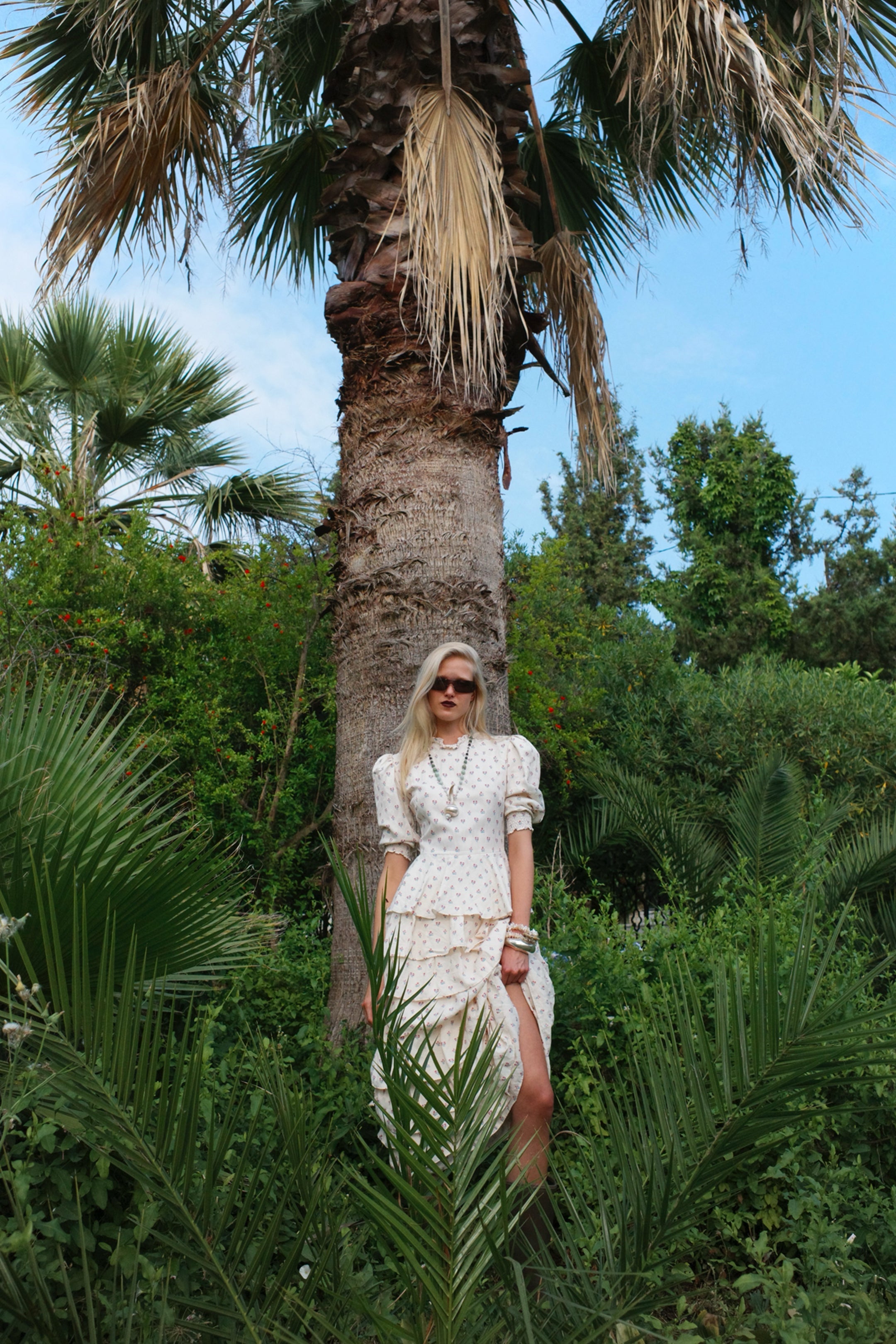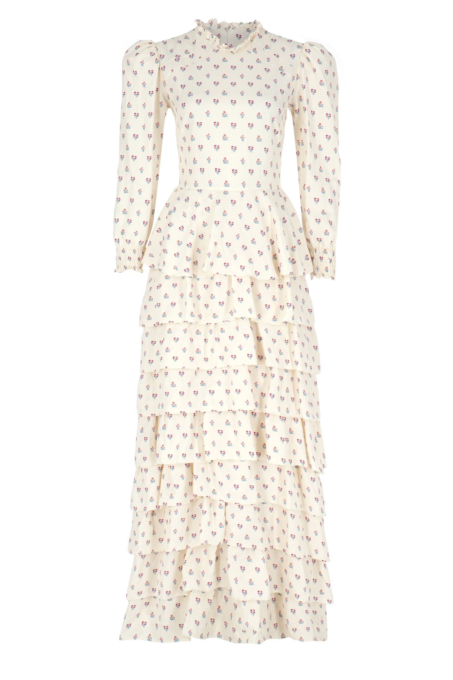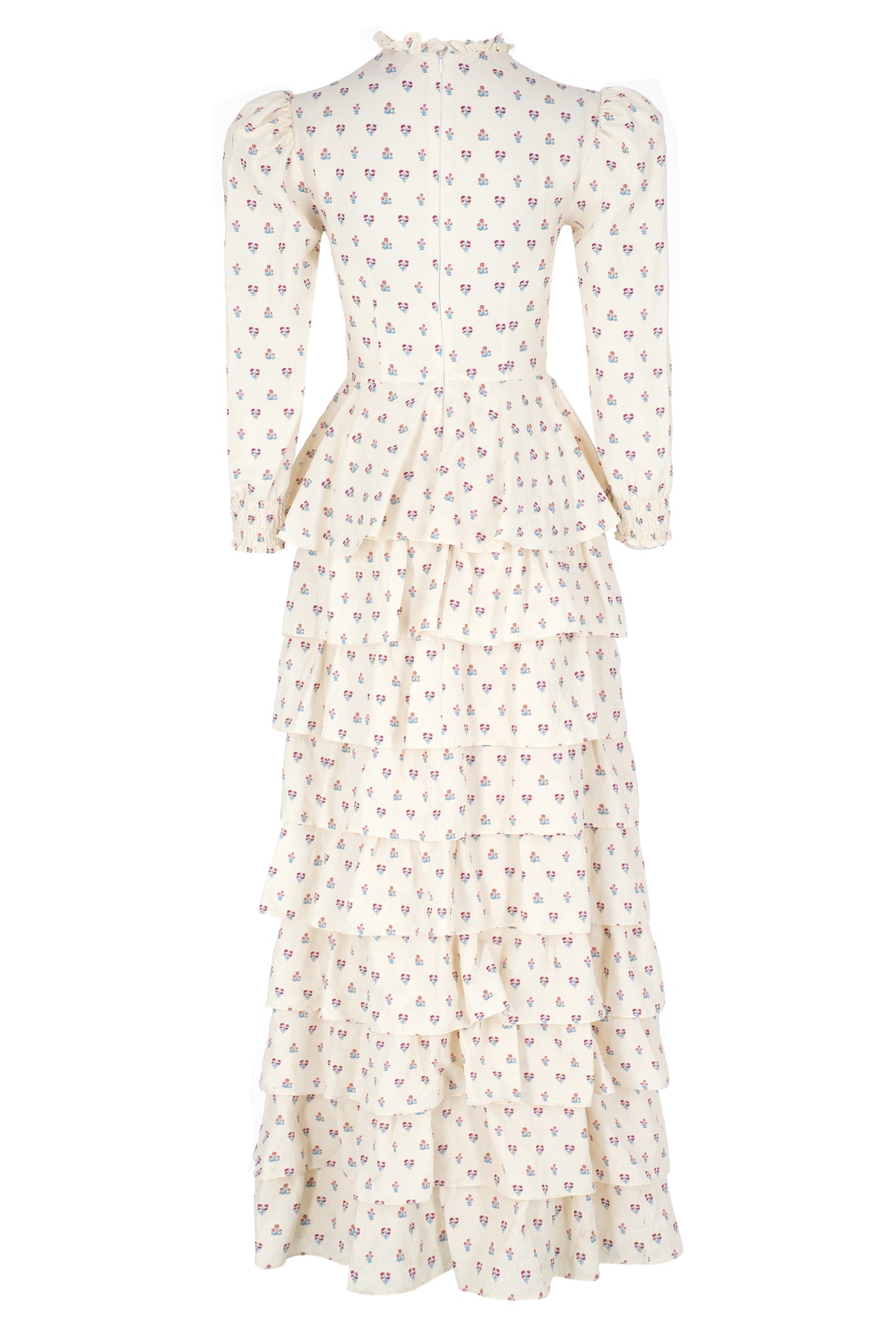 Maxi silhouette with a full layered skirt and a prim, high-necked bodice.