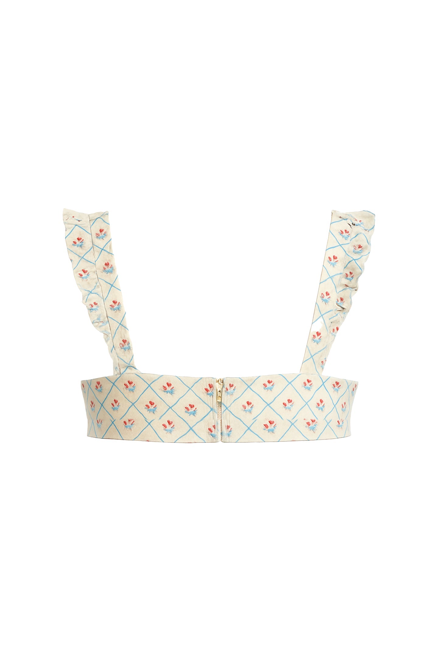 Structured cups, shoulder frills, and dollhouse florals, spun for Sunday mischief.