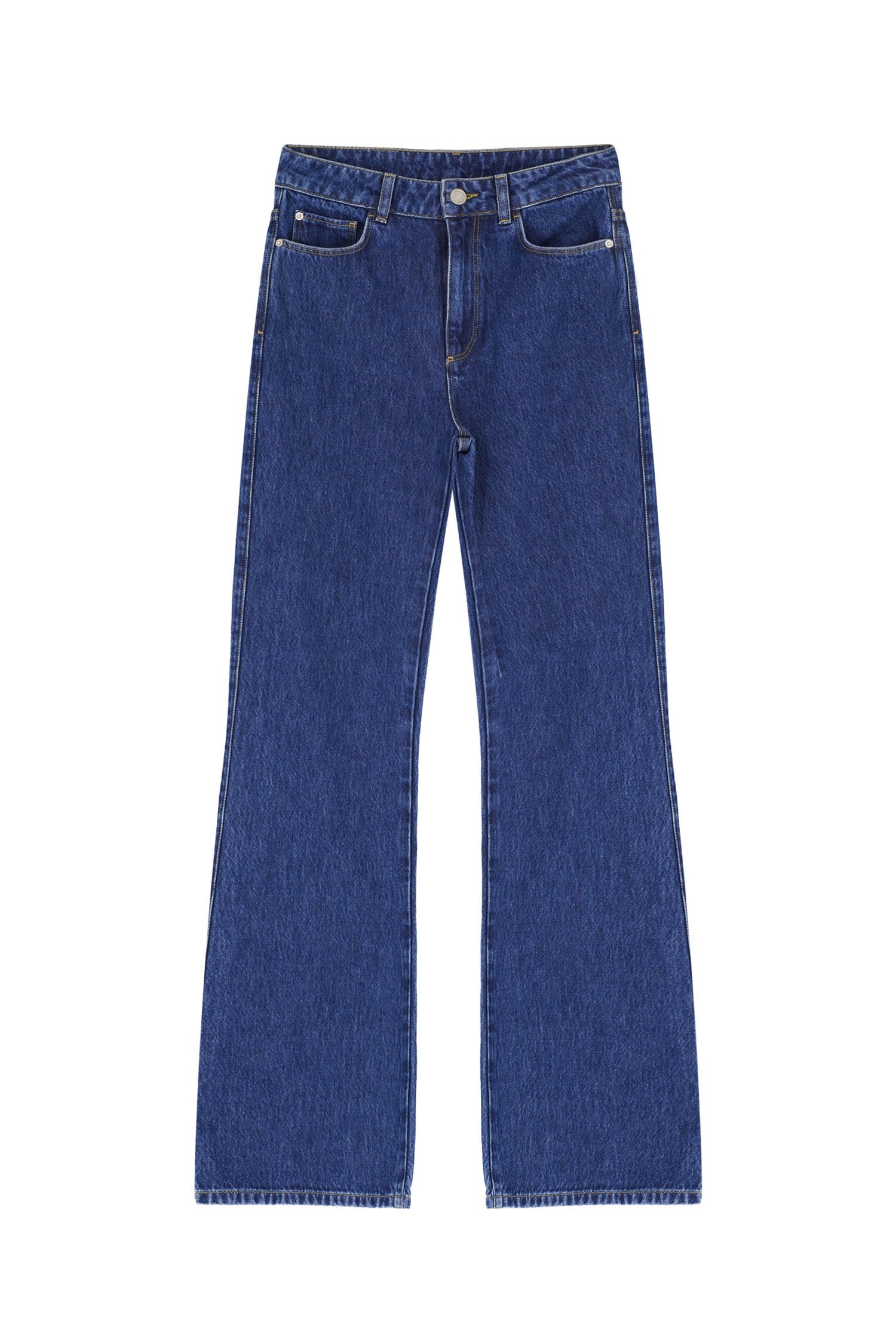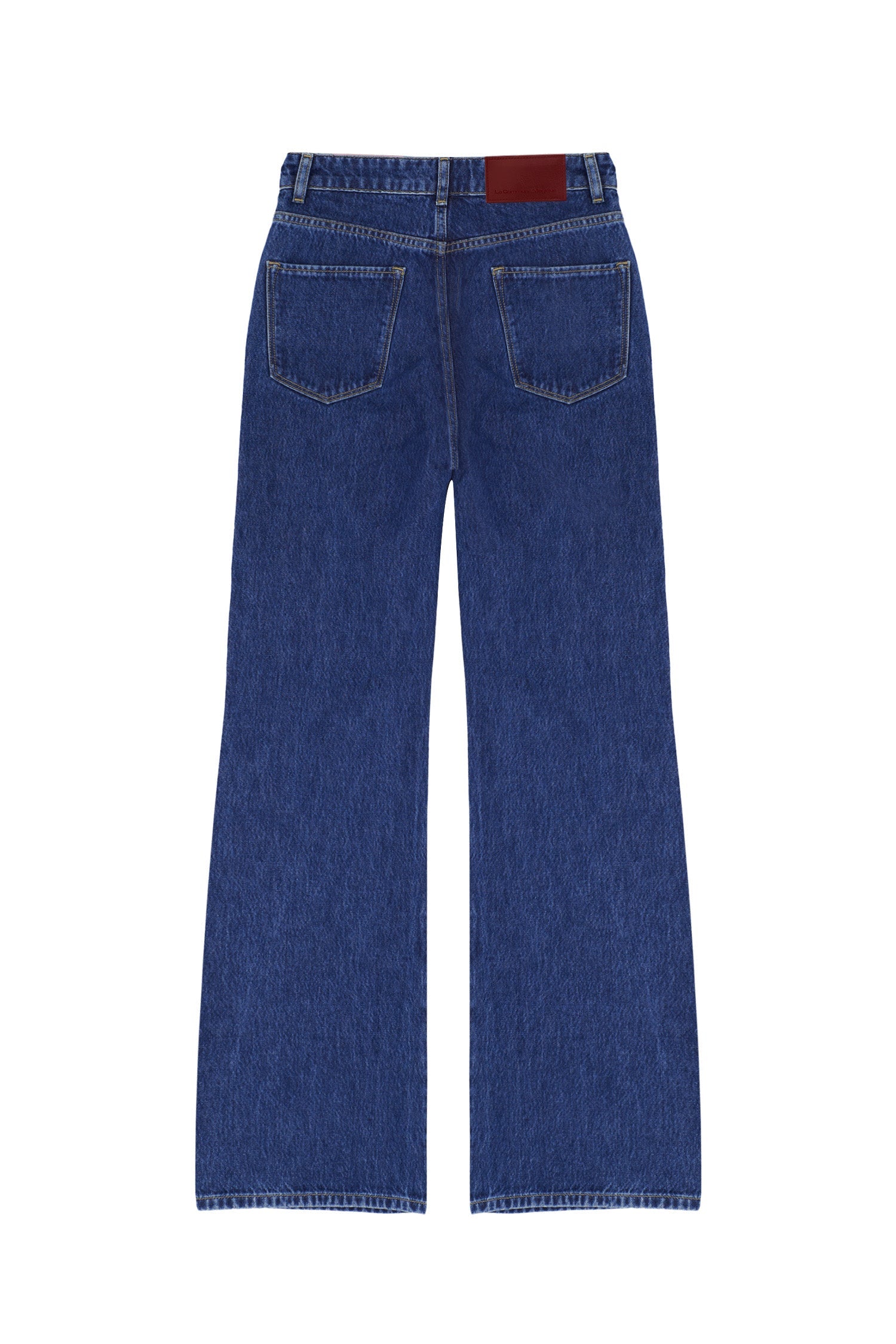 Flare leg mid wash blue denim pants with signature leather label, crafted from cotton blend.