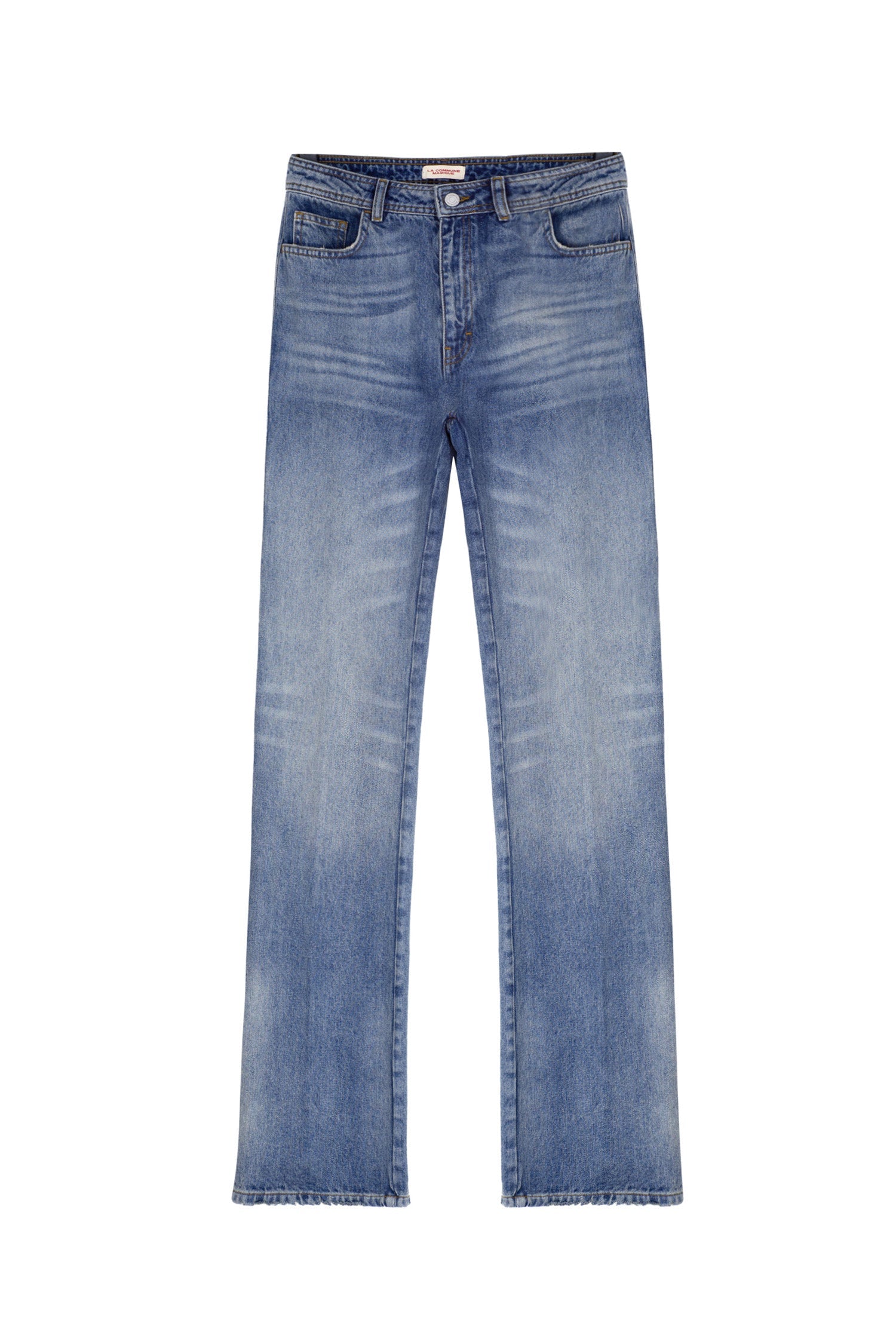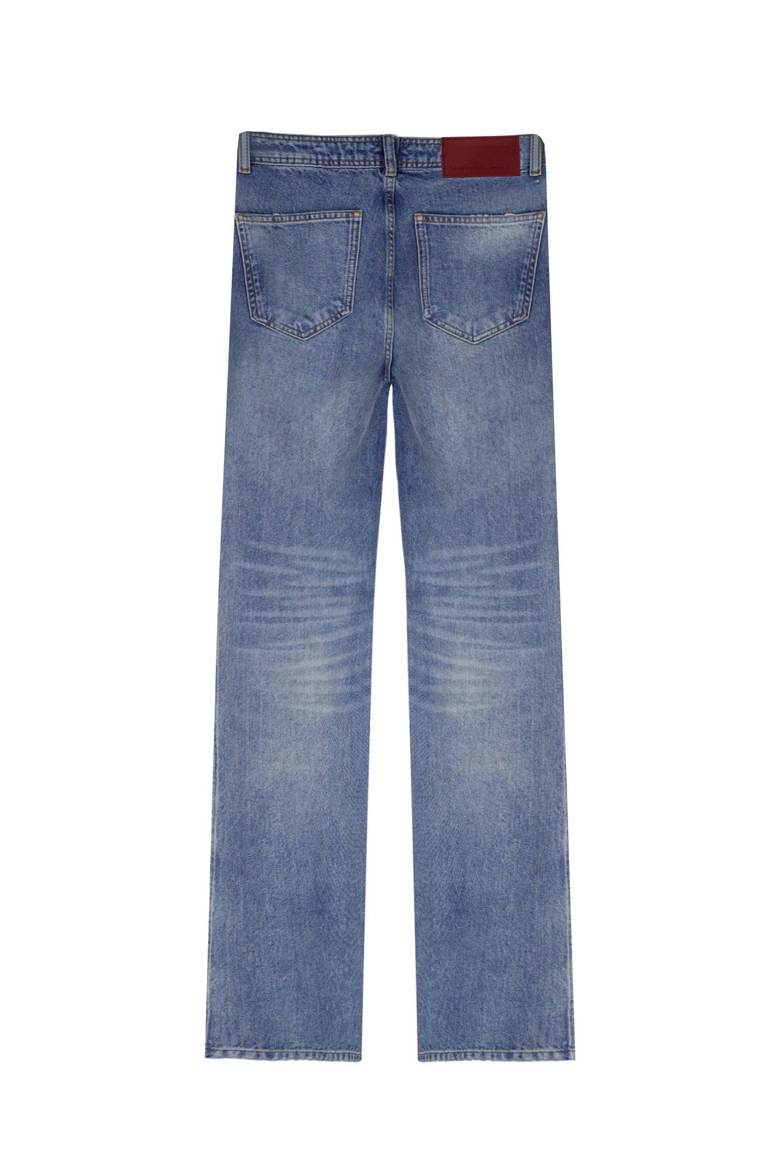 High waist tailored blue denim pants with signature leather label, crafted of 100% cotton.