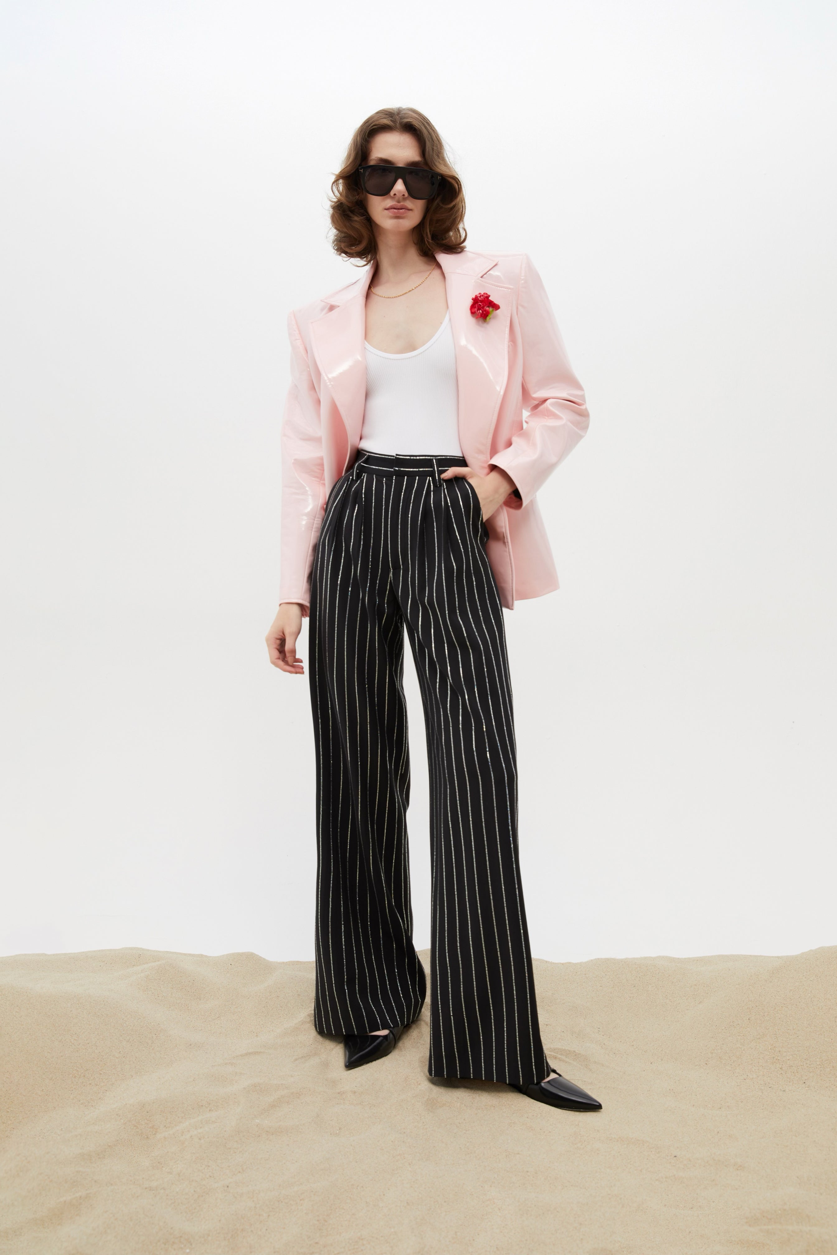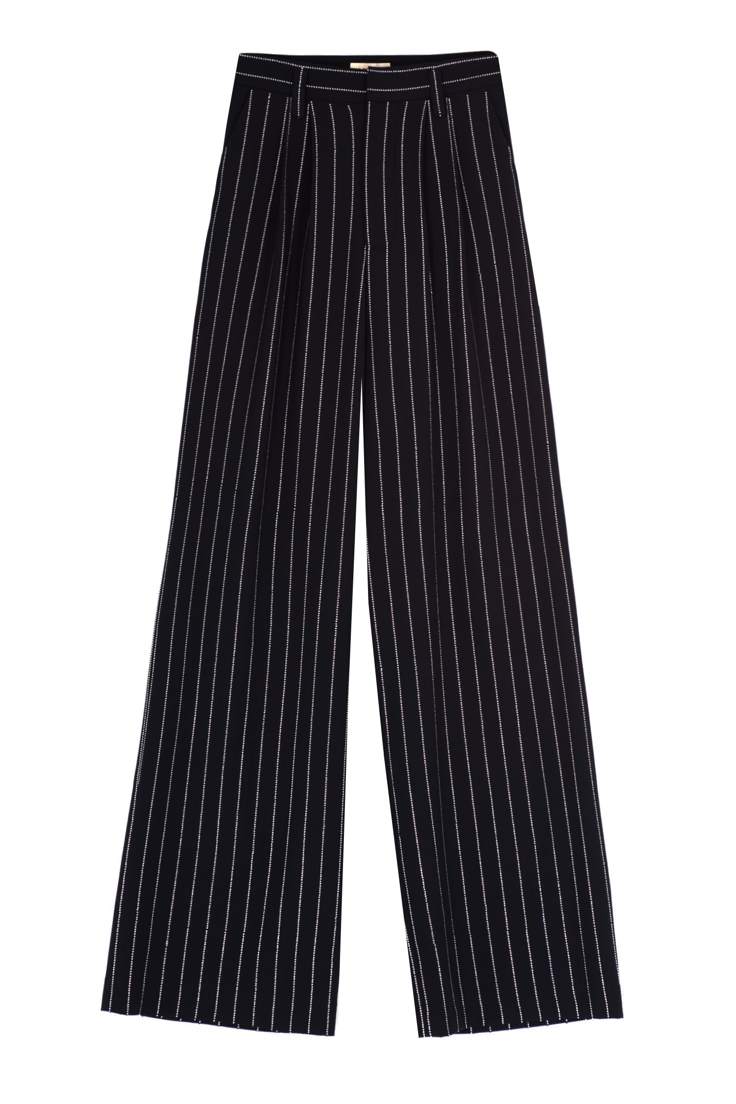 Black wide leg pants with jeweled pinstripe detailing, crafted of cotton blend.