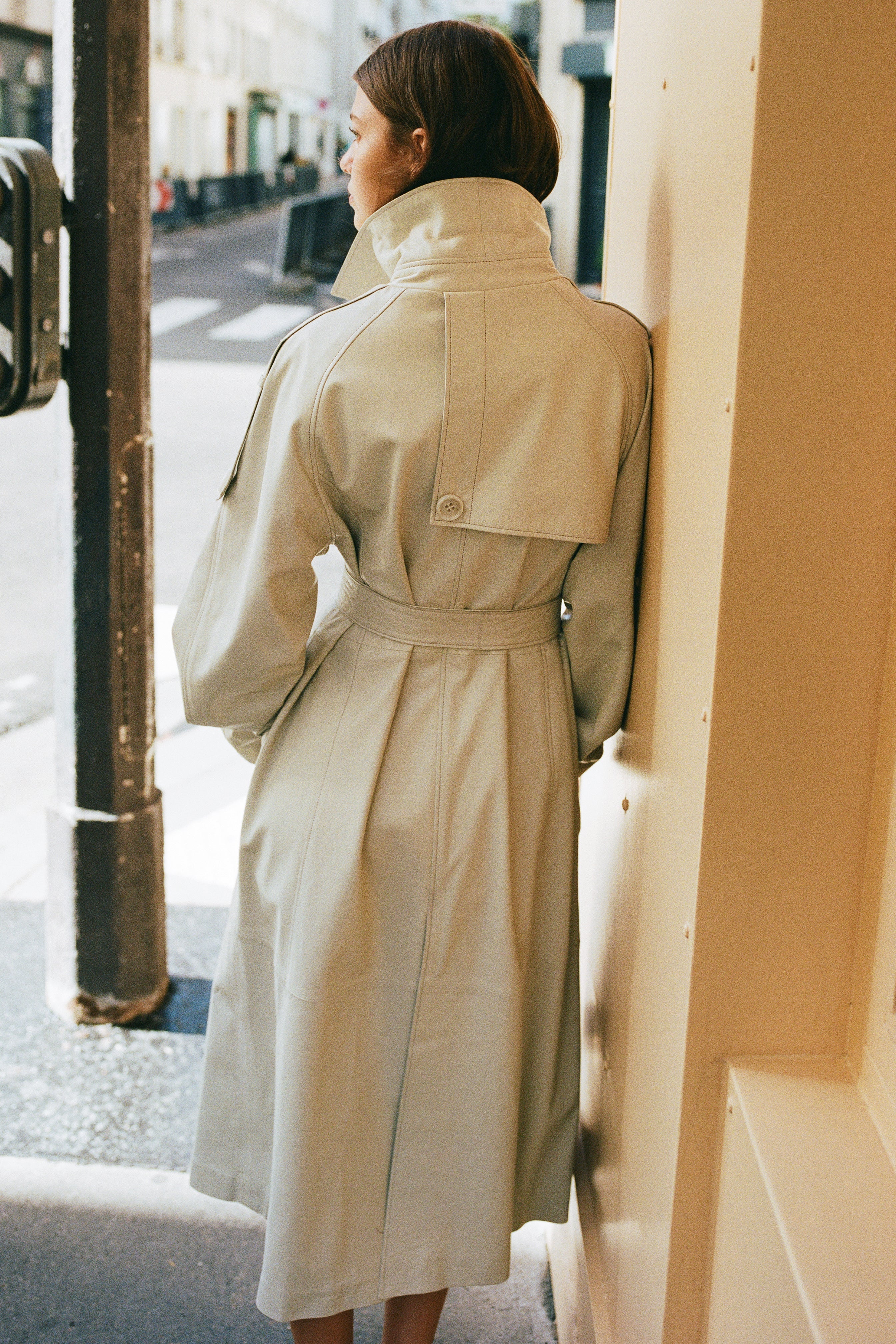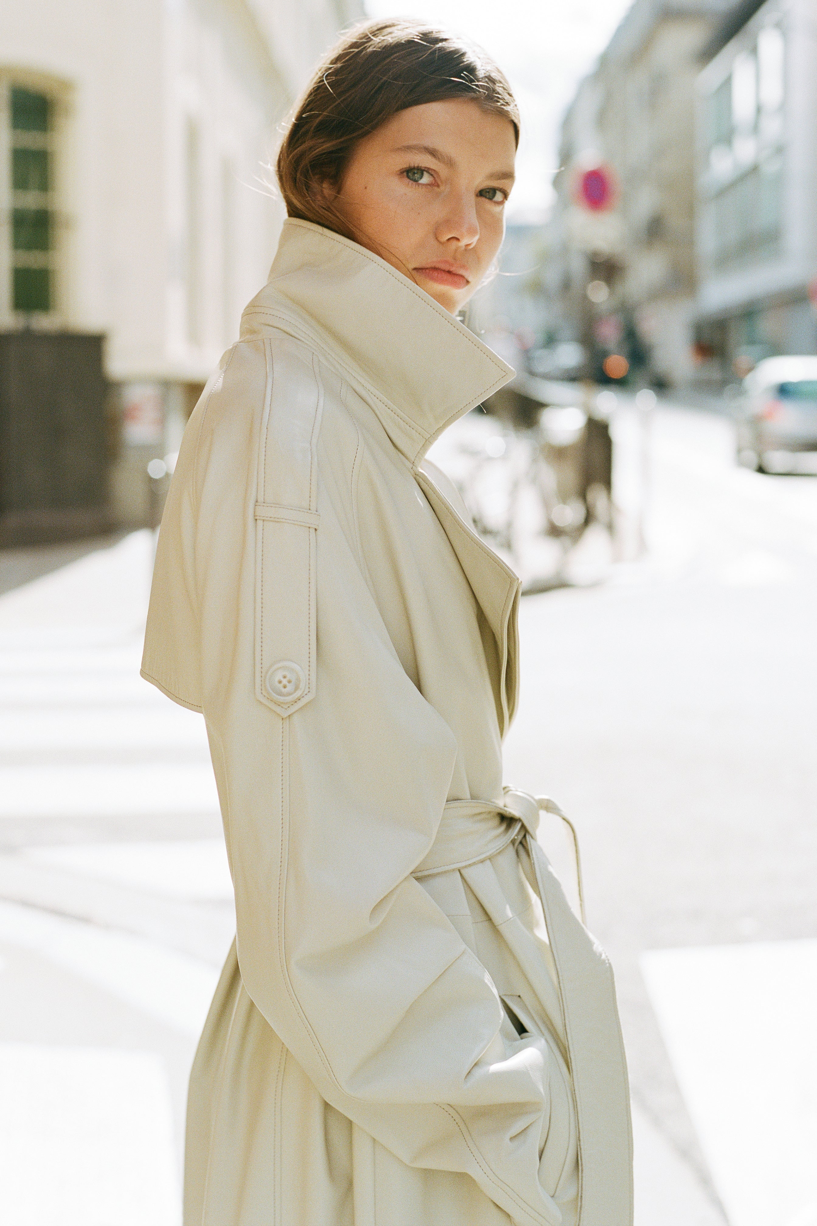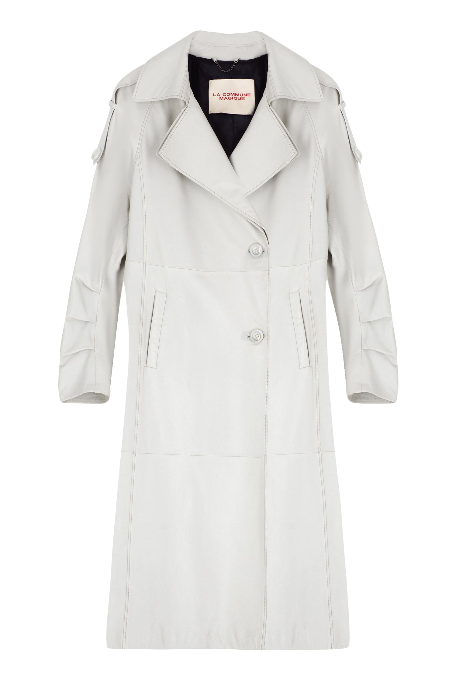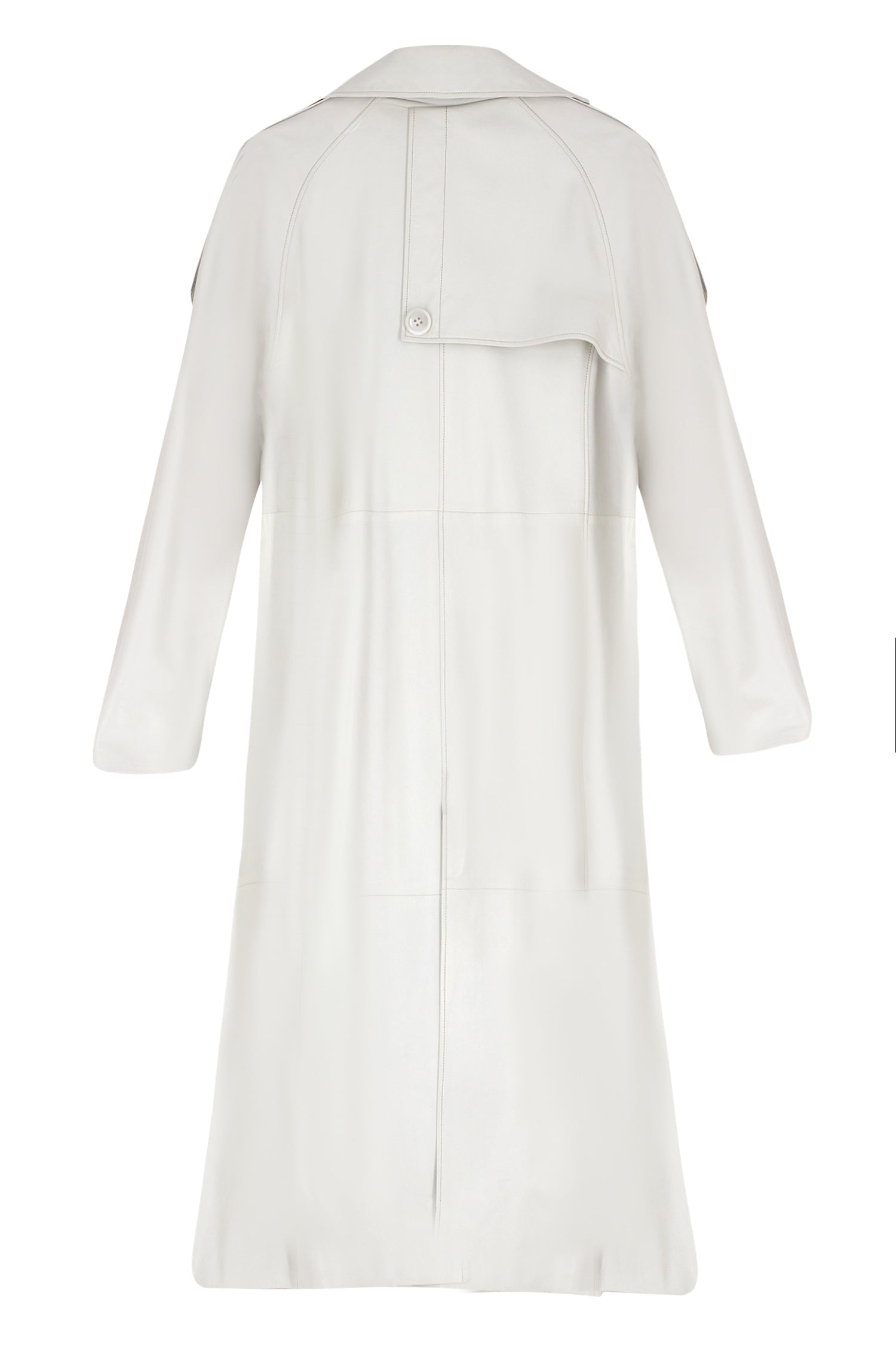 Double breasted off-white long trechcoat with wide notch lapel, waistline pockets, shoulder straps and belt, crafted of 100% Spanish Merino leather.