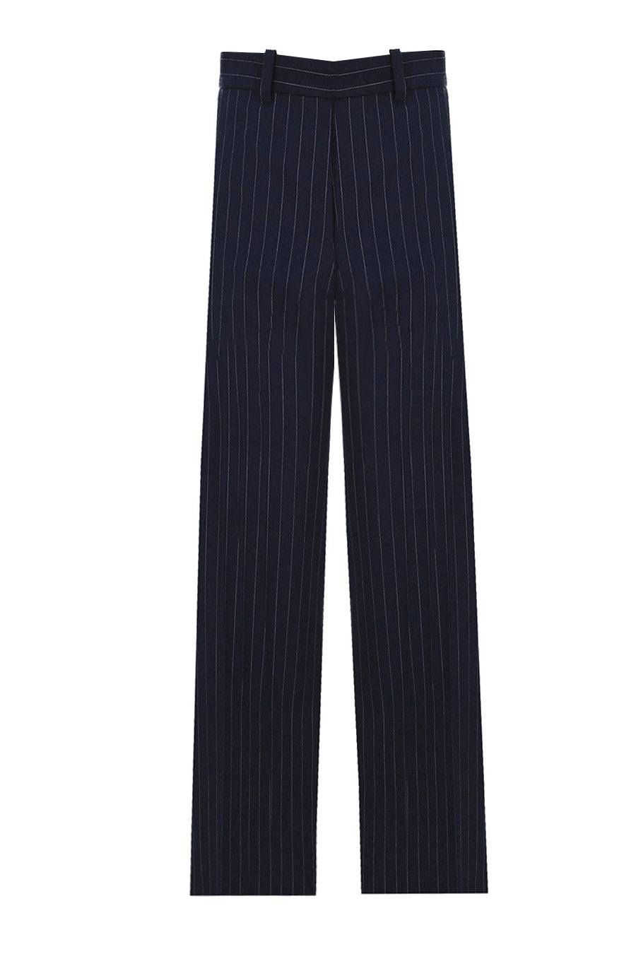 Straight leg pants in dark navy with thin pinstripe detailing, crafted from virgin wool.